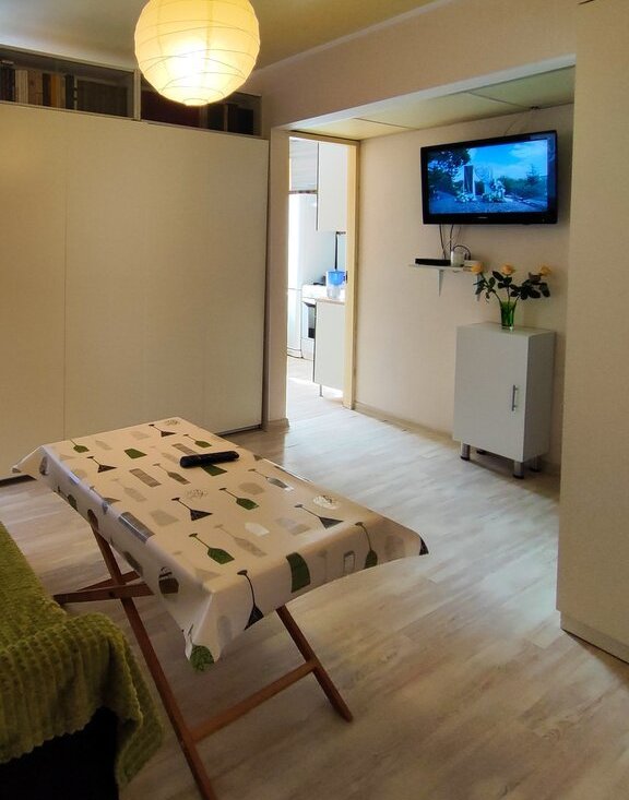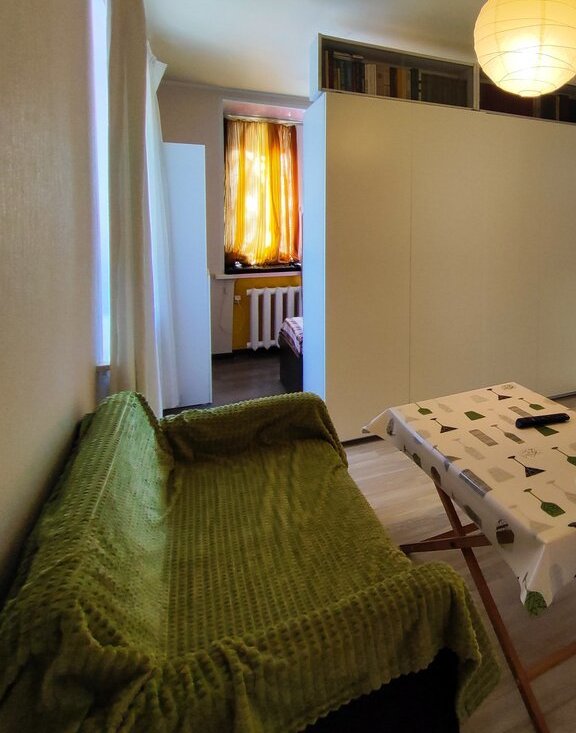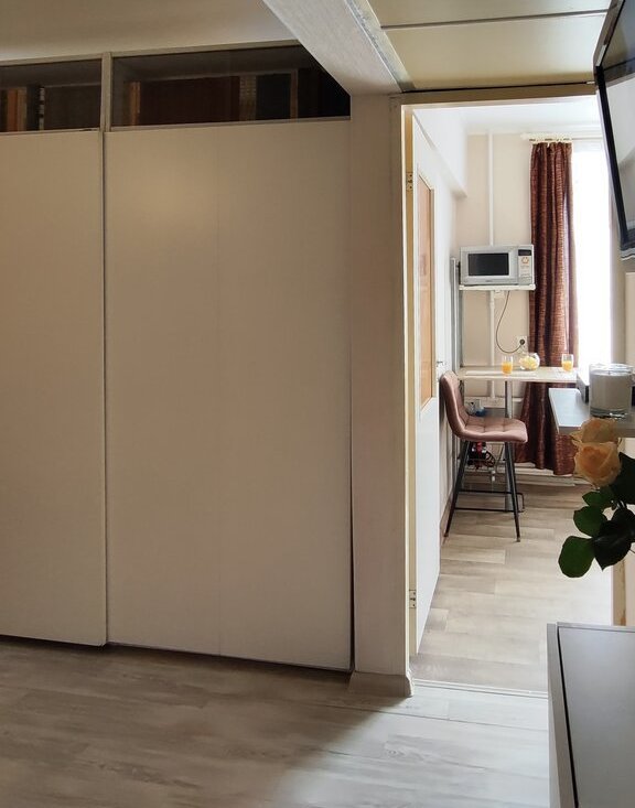 Светлая квартира студийной планировки (зонированная однокомнатная). Идеально подойдет для проживания родителя с ребенком или двух друзей/подруг.