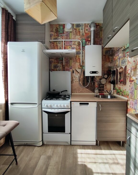 • Кухня. Удобный стол, 2 мягких полубарных стула, холодильник с морозилкой, микроволновка, электрический чайник, газовая плита (духовка + гриль), посудомоечная машина, газовая колонка (нет зависимости от летних отключений воды!)