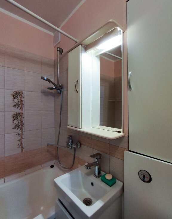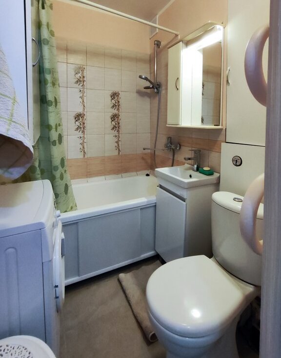 • Ванная. Стиральная машина, ванна, шкафчик с зеркалом и подсветкой, полки для бытовой химии, установлен теплый пол.