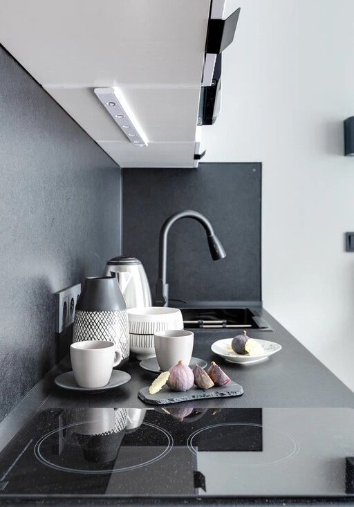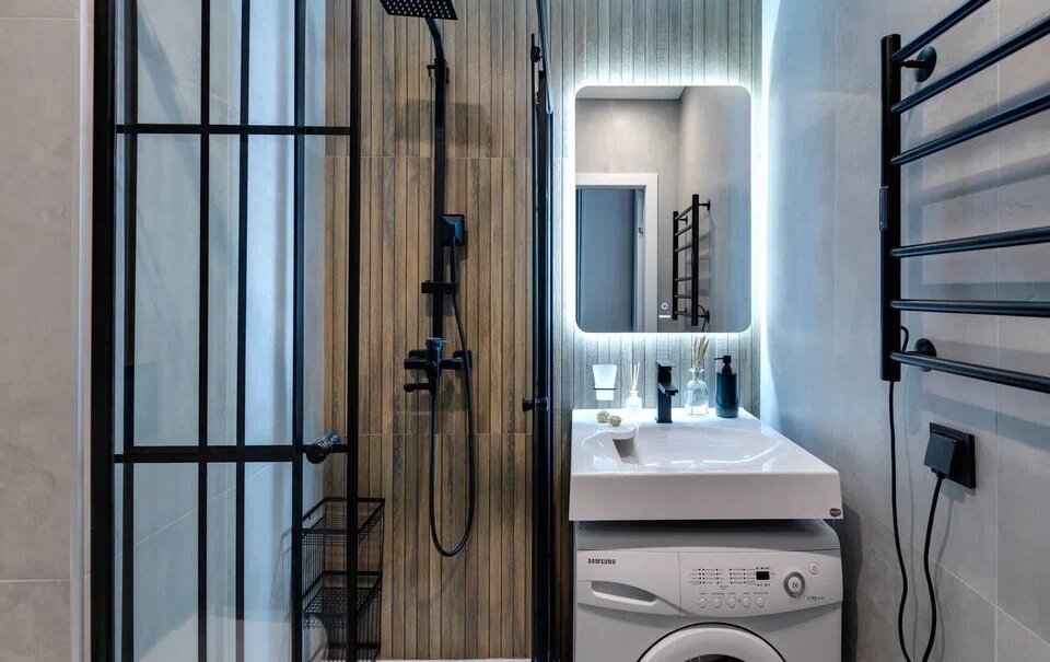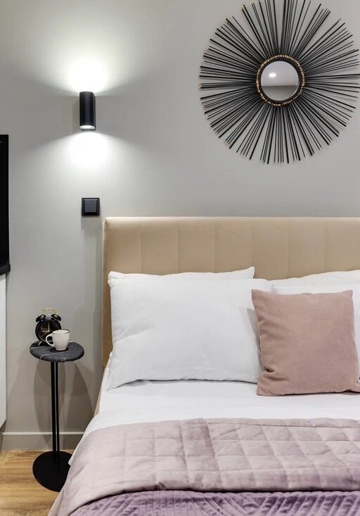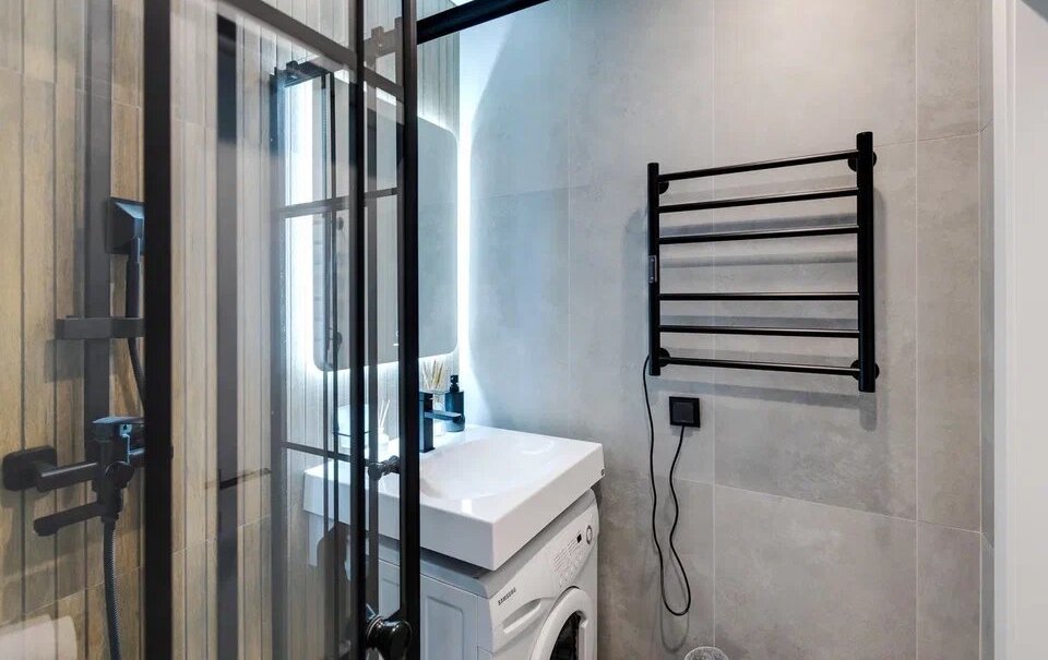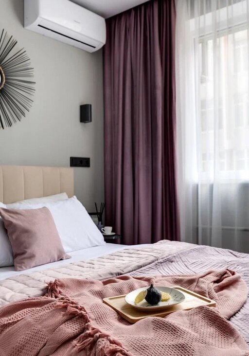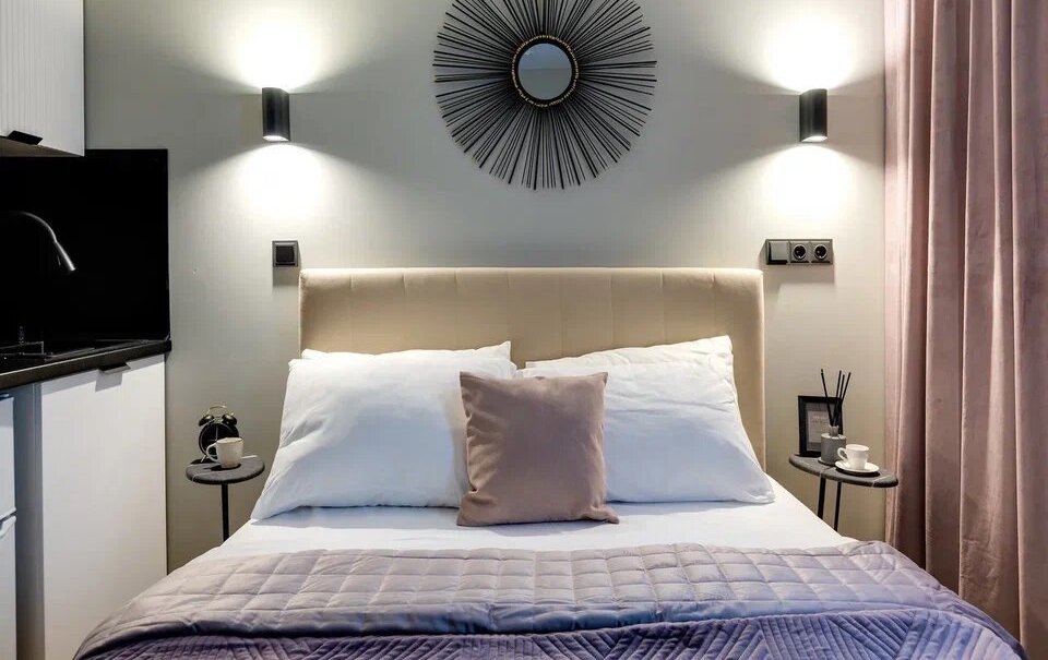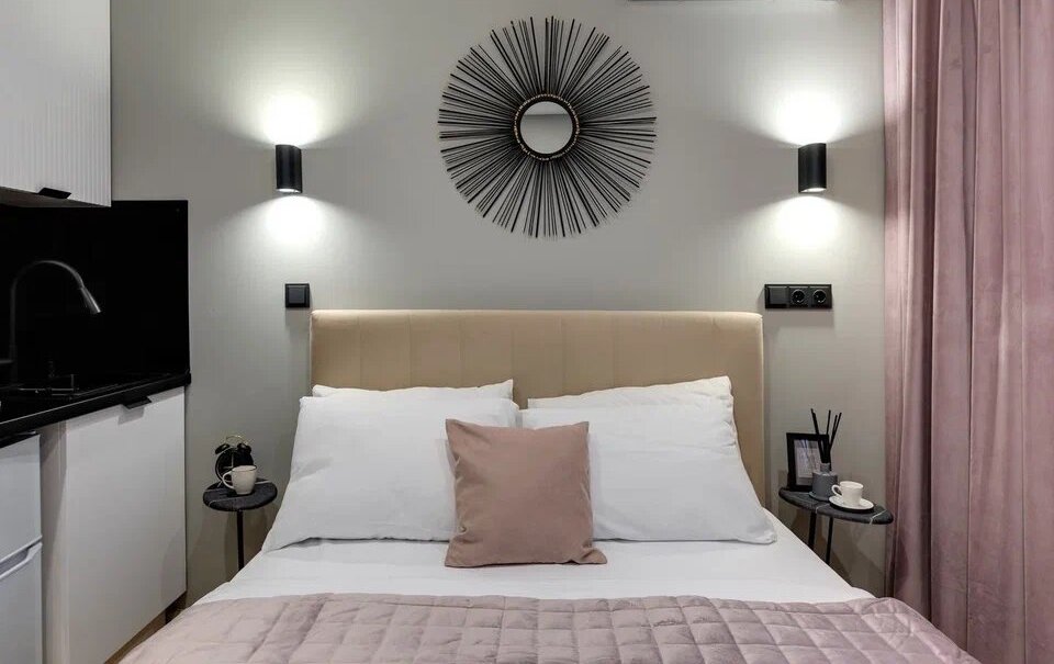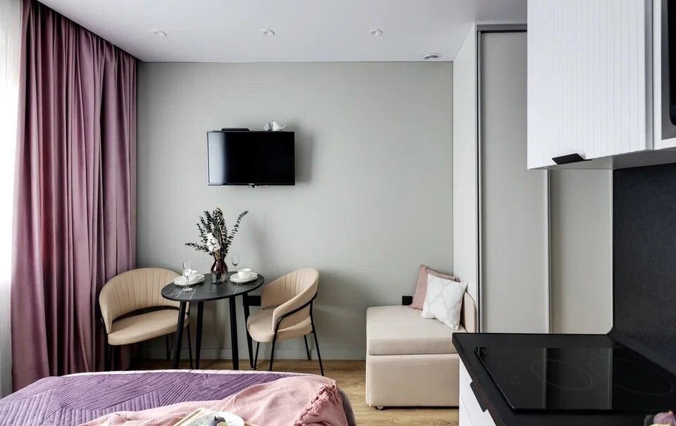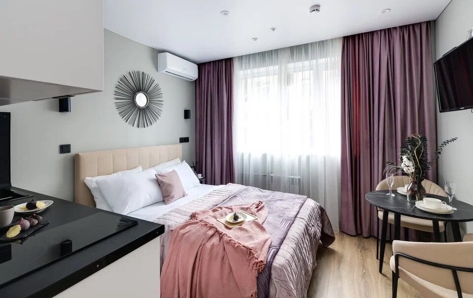 Оснащение (всё остаётся): большая кровать + кресло-кровать, шкаф-купе, кондиционер, холодильник, варочная панель, СВЧ, стиральная машина.
