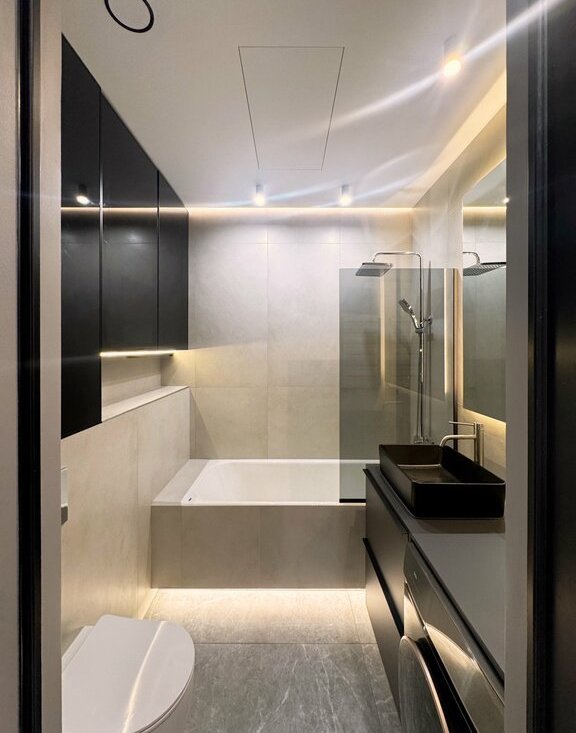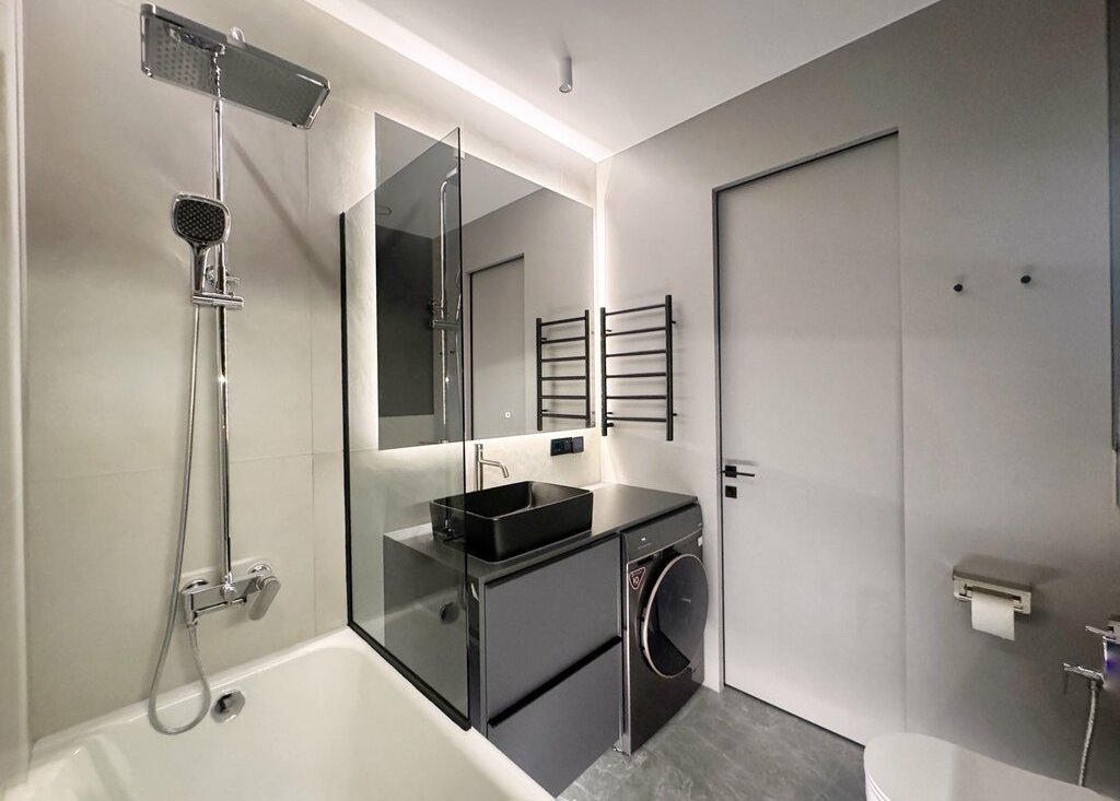 - Санузел оснащен тёплыми полами, ванной и стиральной машинкой с сушкой.