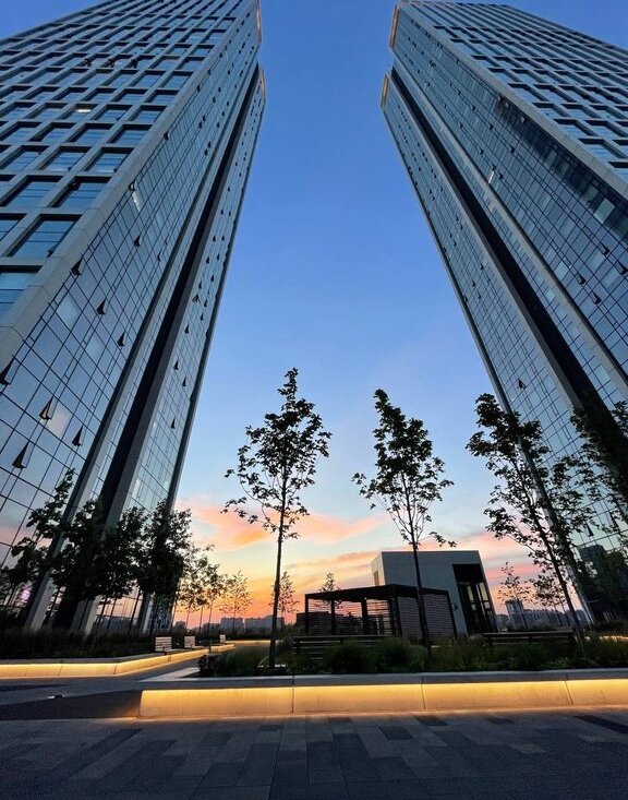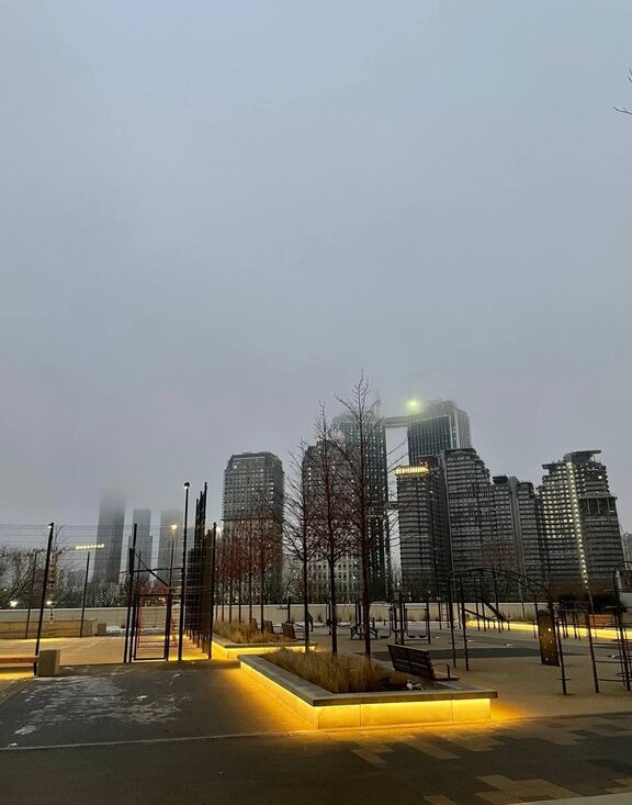 Есть спортивная площадка с теннисными столами, тренажерами и футбольным полем. Просторный газон и мягкая подсветка. Отдельная площадка для выгула собак.