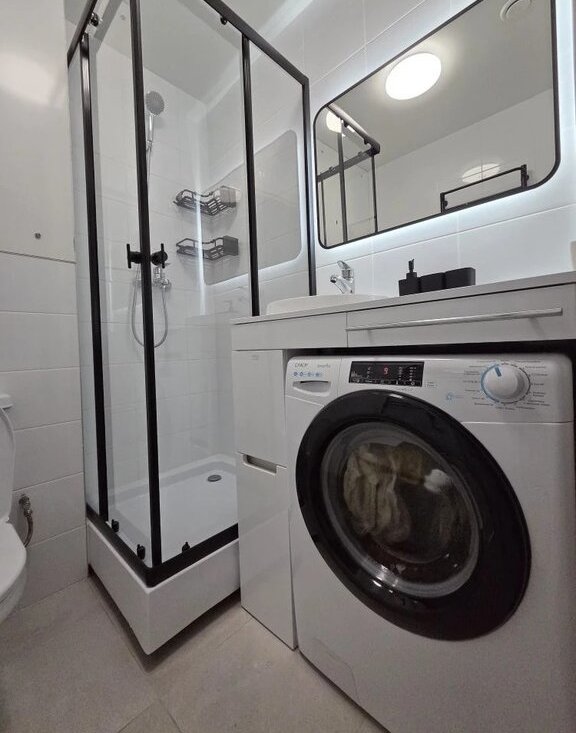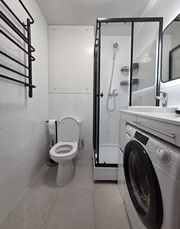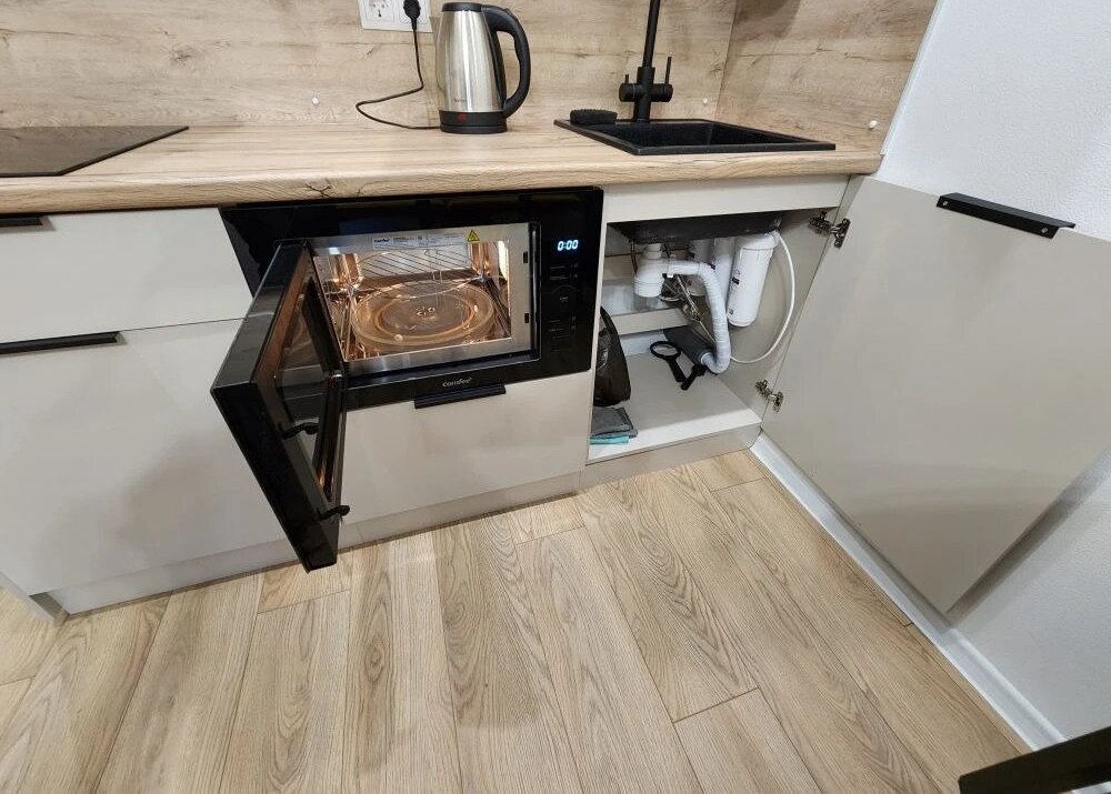 Всё для жизни под рукой. Кухня оборудована всем необходимым: есть холодильник, чайник, встроенная микроволновая печь и необходимая посуда. Обеденная зона компактна, но удобна.