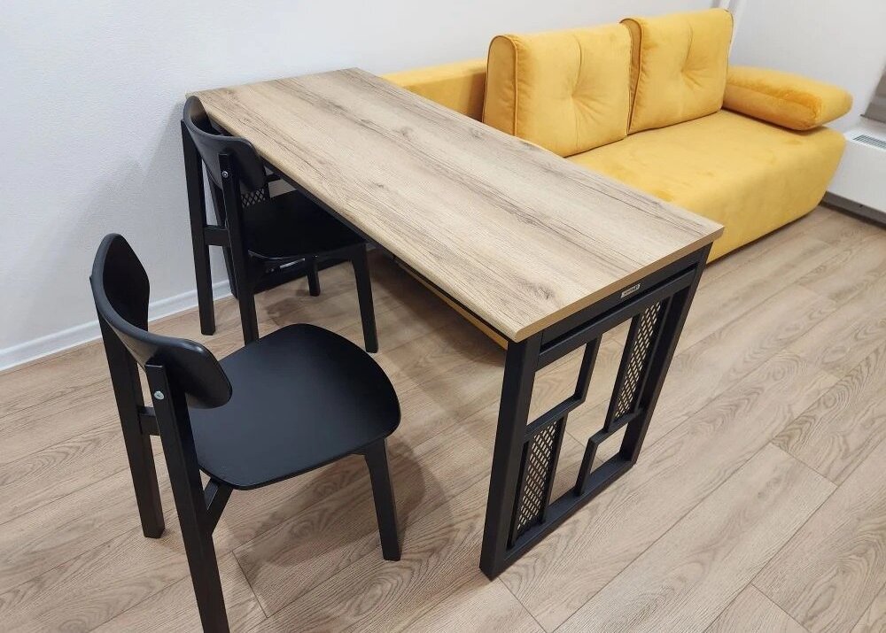 Зона отдыха и работы. Удобный раскладной диван с ящиками, стильное кресло и телевизор — идеальное место для расслабления после насыщенного дня.