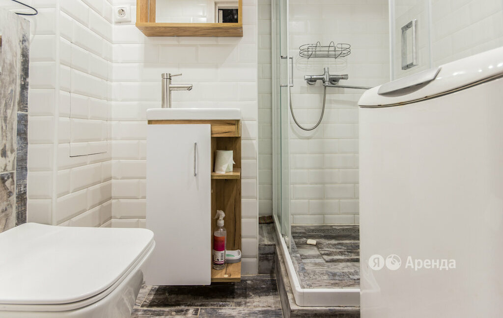 · Совмещенный санузел с душевой кабиной. Стиральная машина, навесной шкаф с зеркалом, раковина с тумбой, фен, зеркало, полотенцесушитель