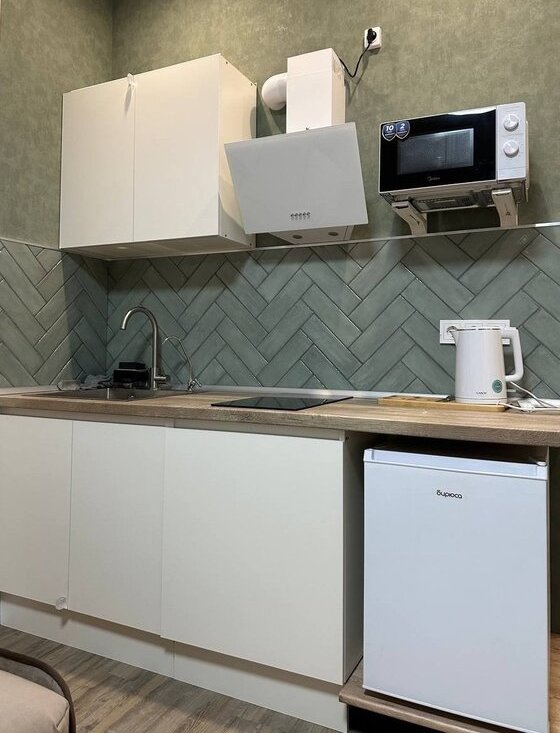 - кухня с варочной панелью, микроволновкой и холодильником;