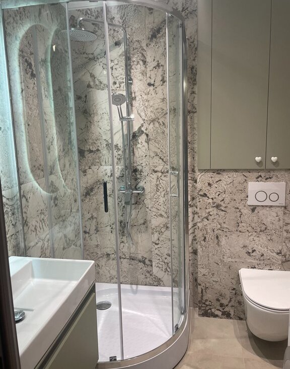 В душевой установлена импортная душевая сантехника и стиральная машина, гарантирующие долговечность и надежность.