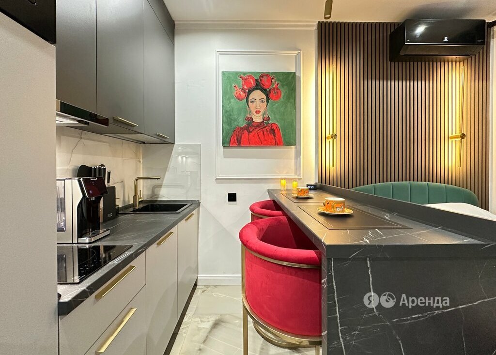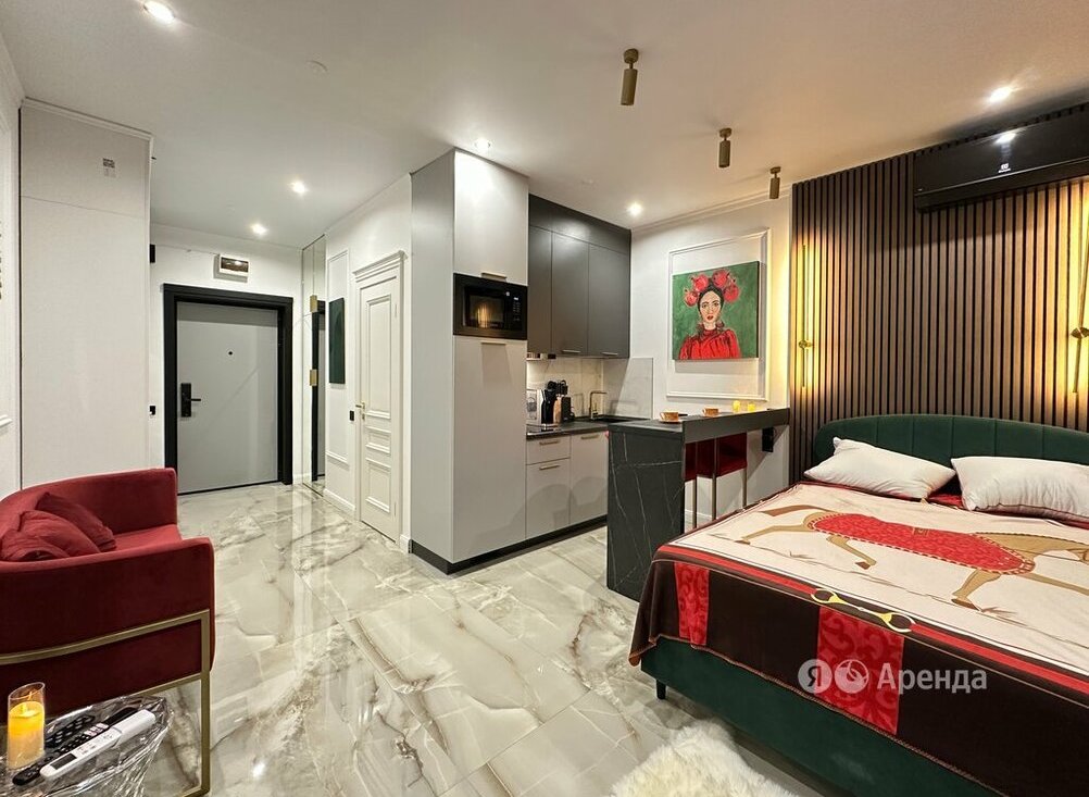 Сдаётся студия площадью 25 кв.м. с дизайнерским ремонтом на 21 этаже в 24-этажном доме на срок от 11 месяцев. Из техники есть: