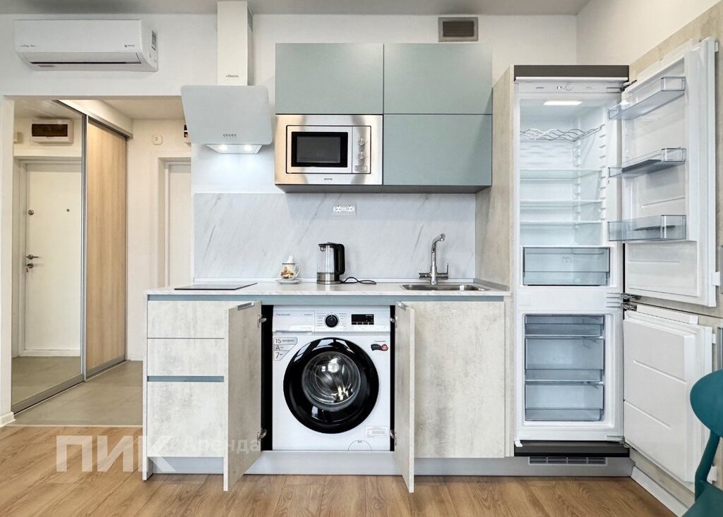 Квартира оборудована кухонным гарнитуром, мебелью и бытовой техникой. Есть: