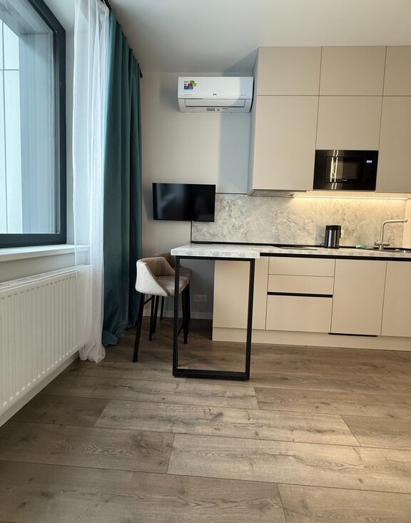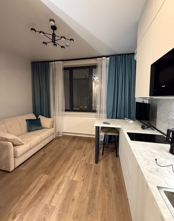 Квартира чистая, светлая, тёплая и уютная, в отличном состоянии, полностью оборудована для проживания: мебель, интернет, микроволновая печь, посудомоечная машина, кондиционер, чайник, телевизор, стиральная машина, холодильник, много места для хранения вещей. Новое абсолютно всё. Интеллигентный собственник. Санузел совмещенный, балкона нет.