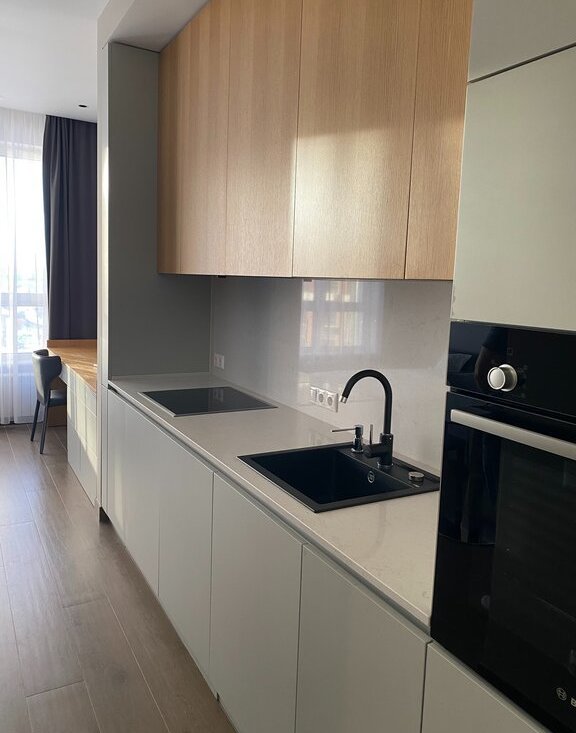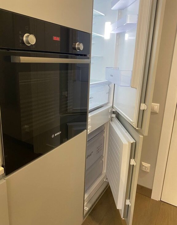 Полноценная кухня c необходимой премиальной техникой и посудой: посудомоечная машина BOSCH, встроенный холодильник с морозильной камерой BOSCH, варочная поверхность BOSCH, сантехника BLANCO, вытяжка, посуда.