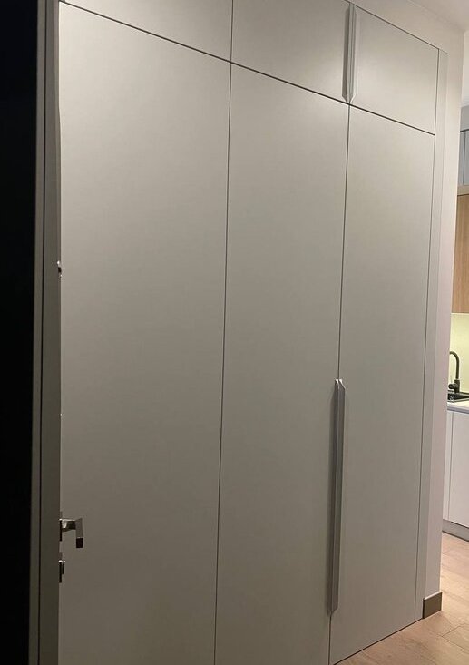 Система хранения индивидуального проекта представлена шкафом с отдельными зонами для верхней одежды, обуви и бытовых принадлежностей.