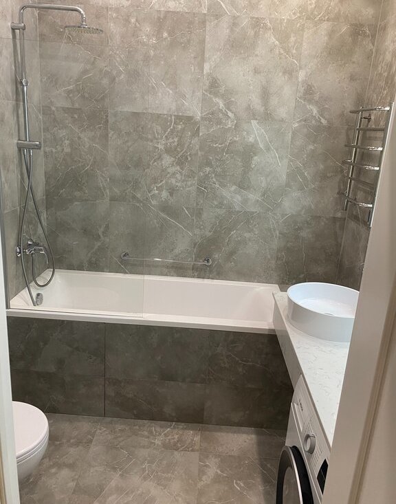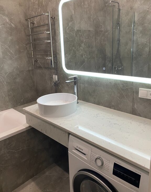 В санузле находится ванна из литьевого мрамора, премиальная сантехника санузла GEBERIT, GROHE, стиральная машина BOSCH.