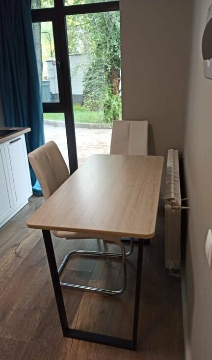 В студии есть всё необходимое для комфортного проживания для одного человека или семейной пары. Высокие потолки расширяют пространство. одно большое окно в пол выход в тихий дворик, где есть лавочки и подсветка.