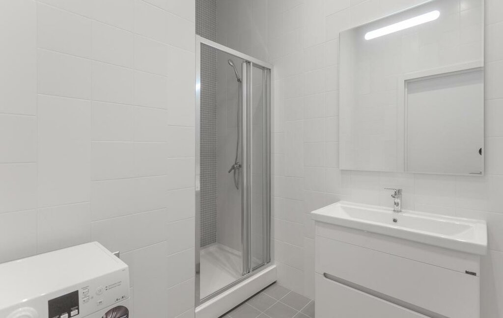 В квартире один совмещенный санузел с душевой кабиной, раковиной и зеркалом с подсветкой и стиральной машиной.