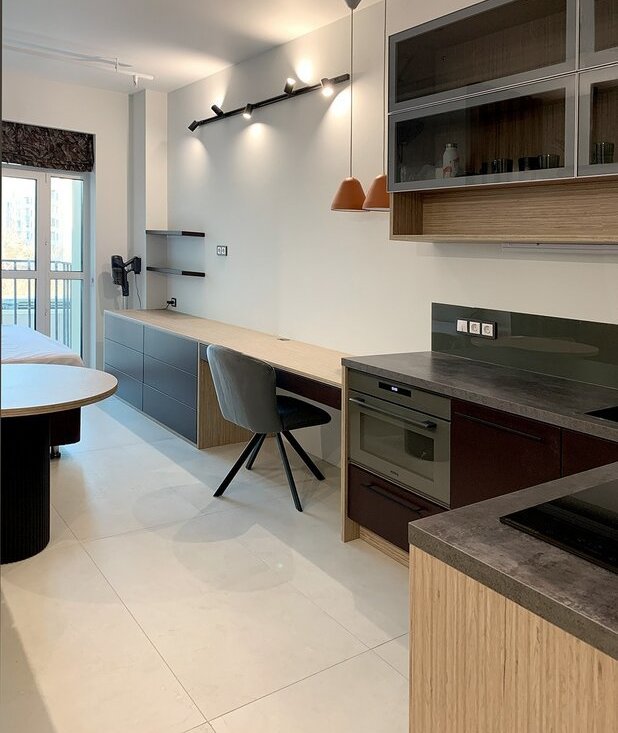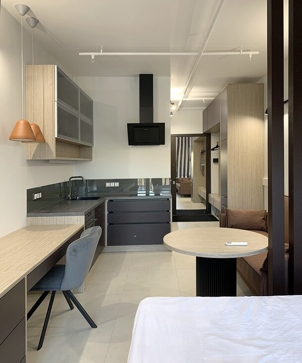 Чистая, светлая студия с балконом, выполнен качественный капитальный ремонт, установлена вся необходимая мебель, техника и оборудование, интернет, видео-домофон, кондиционер, теплые полы, водонагреватель, аккумуляторный пылесос. Много мест для хранения, гардеробная, комод, рабочий стол, обеденный стол, кровать с подъемным механизмом, большой диван, на кухне - большие ящики для хранения, СВЧ совмещенная с духовкой, встроенный полноразмерный холодильник и морозильник, варочная панель на 2 конфорки, вытяжка, посудомоечная машина, фильтр питьевой воды, в санузле - душевая зона, стиральная машина, шкаф для хранения уборочного инвентаря.