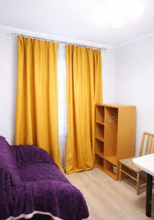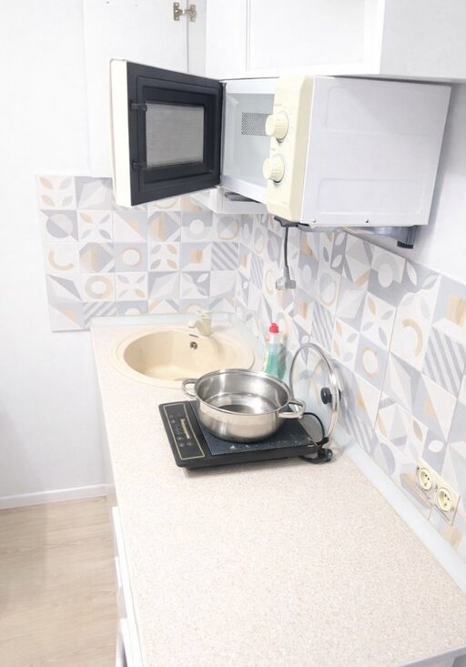 Небольшая уютная студия для одного человека. Есть все необходимое: диван, стиральная машина, микроволновая печь, столик, однокомфорочная индукционная плита, небольшой холодильник, душевая.