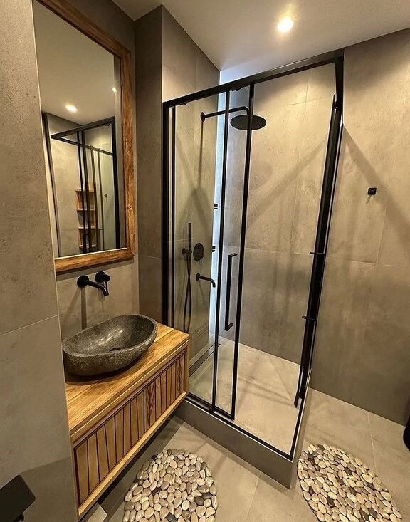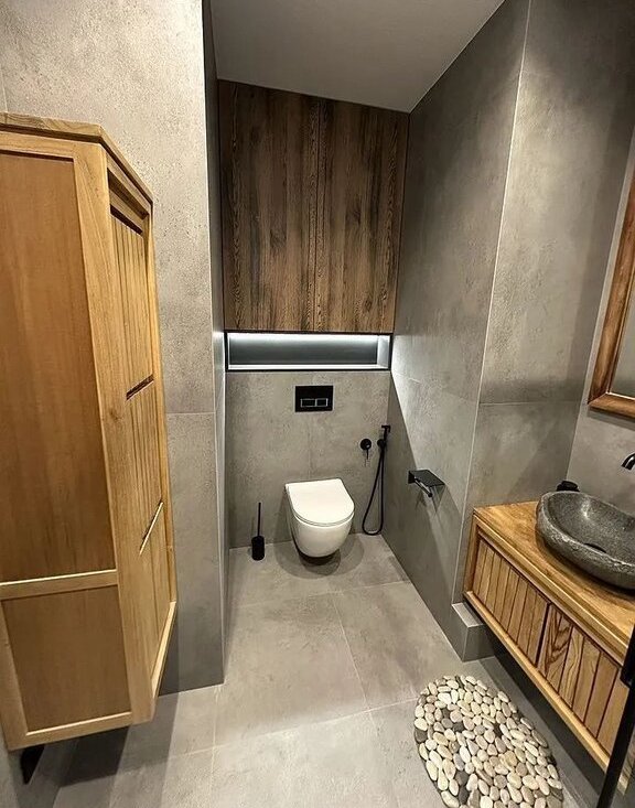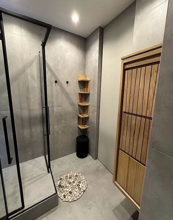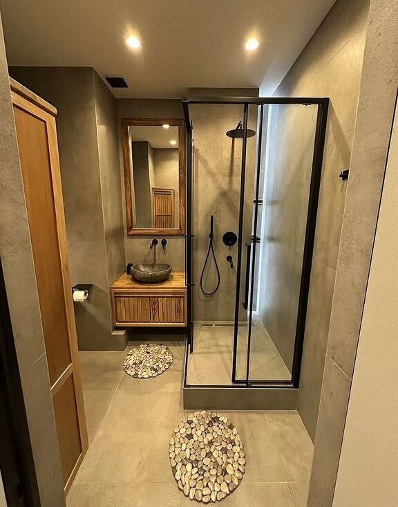 Санузел - теплый пол, фен и электрический проточный водонагреватель.