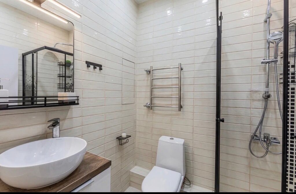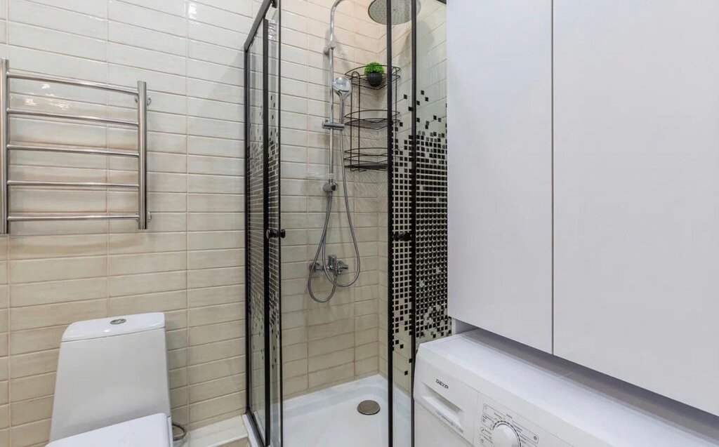 Красивый санузел с душевой кабиной и большим шкафом для хранения вещей. Новая сантехника.