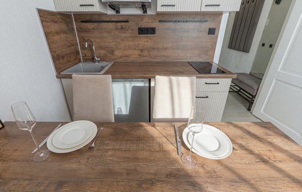В квартире новый ремонт и есть всё необходимое для комфортного проживания: холодильник, посудомоечная машина, стиральная машина, ТВ, двуспальная кровать, обустроенная кухня, шкаф, комод.