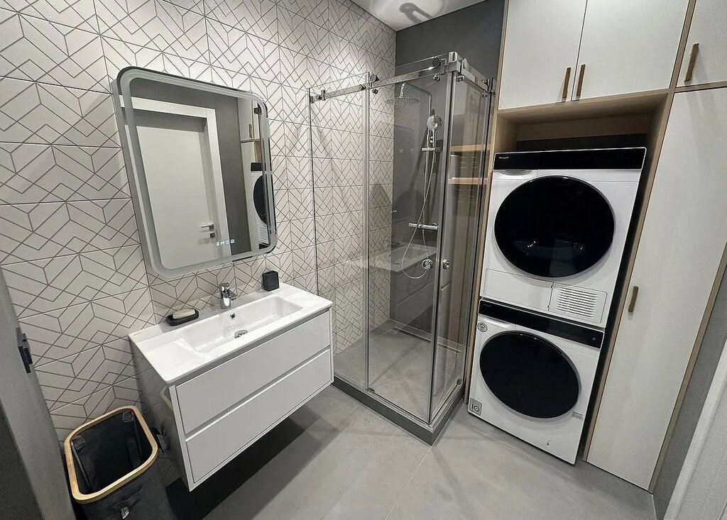 Имеется встроенная современная кухня со всей бытовой техникой (вытяжка, электроплита, духовой шкаф, посудомоечная машина, холодильник), водонагреватель и отдельные теплые полы в сан. узле и на кухне, мульти-сплит система кондиционеров в гостиной и в спальне, импортная сан. техника, датчики протечки воды, разводка под компьютерную сеть и Wi-Fi.