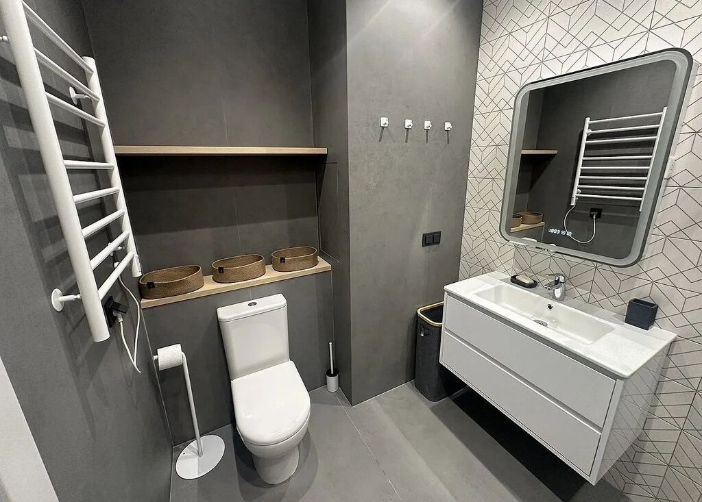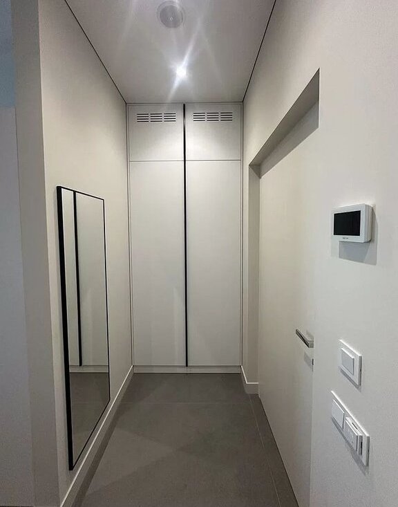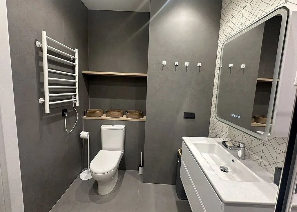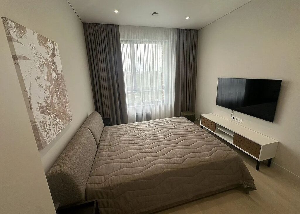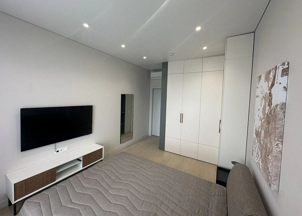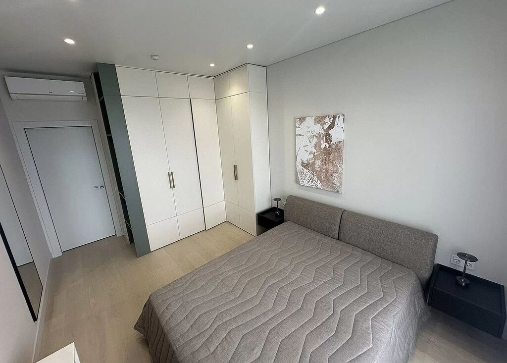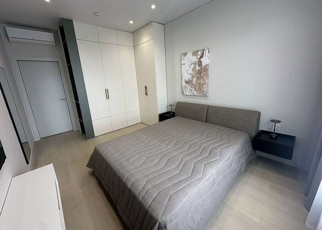 Имеется встроенная современная кухня со всей бытовой техникой (вытяжка, электроплита, духовой шкаф, посудомоечная машина, холодильник), водонагреватель и отдельные теплые полы в сан. узле и на кухне, мульти-сплит система кондиционеров в гостиной и в спальне, импортная сан. техника, датчики протечки воды, разводка под компьютерную сеть и Wi-Fi.