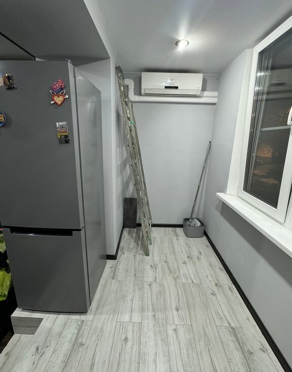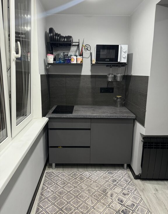 Балкон-лоджия оформлен под кухню. Есть микроволновка, варочная панель, холодильник, посуда.