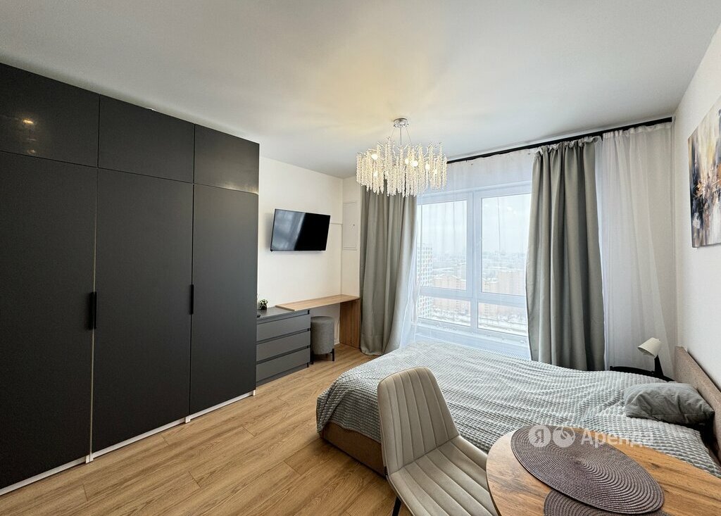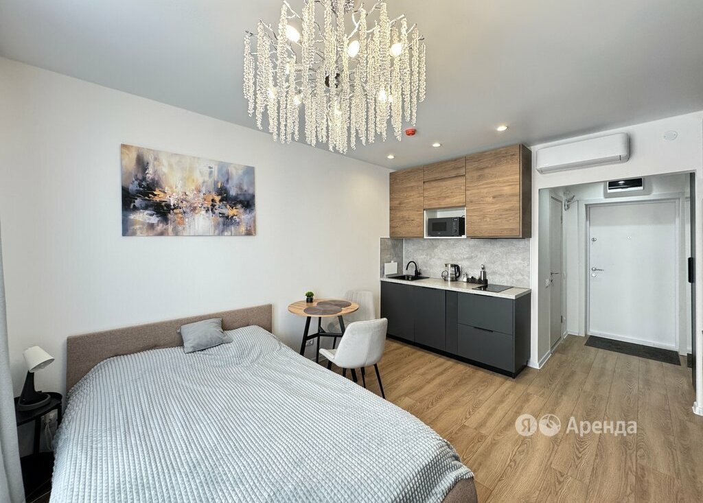 Сдаётся студия площадью 22 кв.м. с дизайнерским ремонтом на 22 этаже в 24-этажном доме на срок от 11 месяцев. Из техники есть: