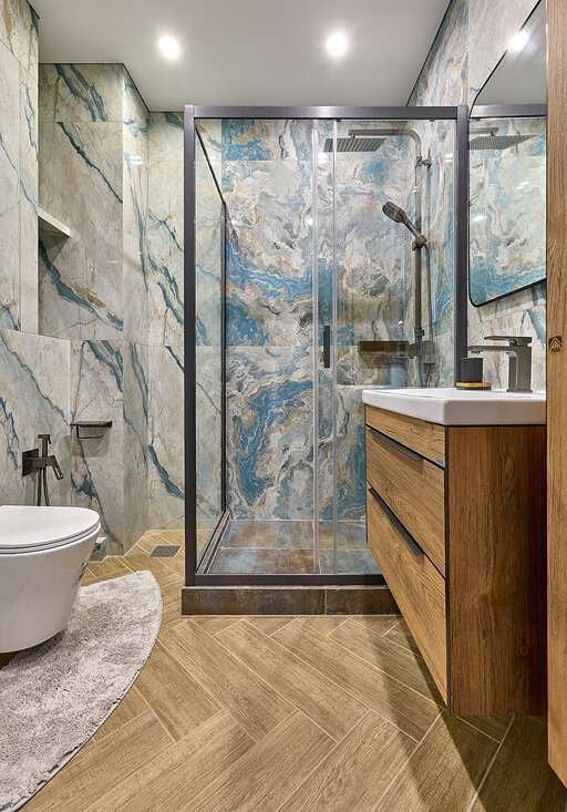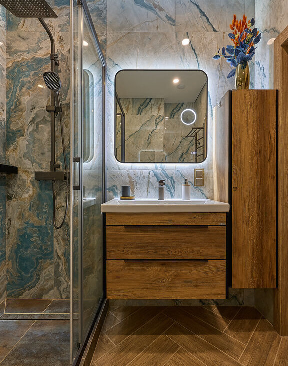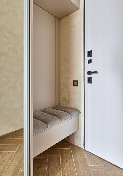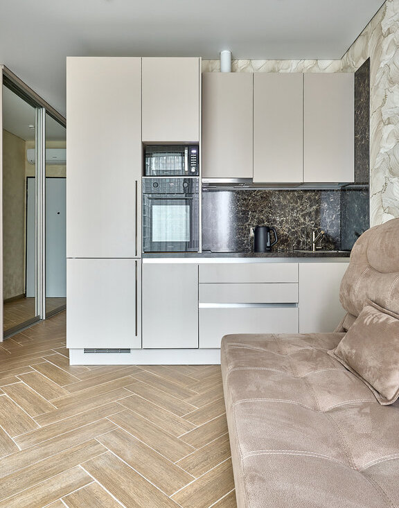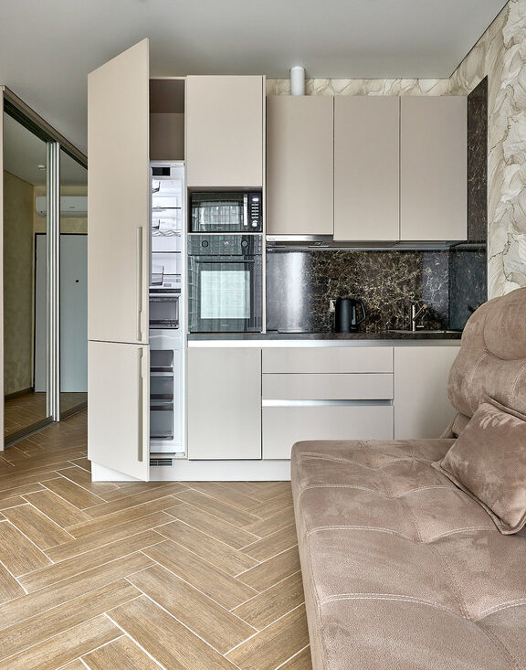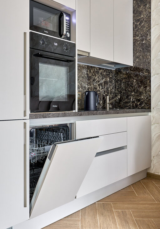 В кухне предусмотрели встроенный холодильник и посудомоечную машину.