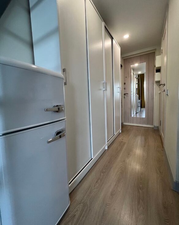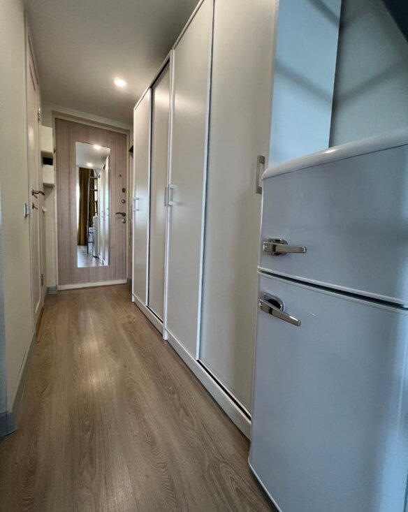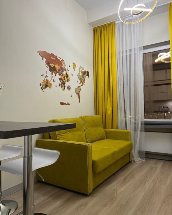 Студия мебелирована, оснащена всей необходимой техникой (телевизор, стиральная машина, холодильник, варочная панель, микроволновка, чайник).