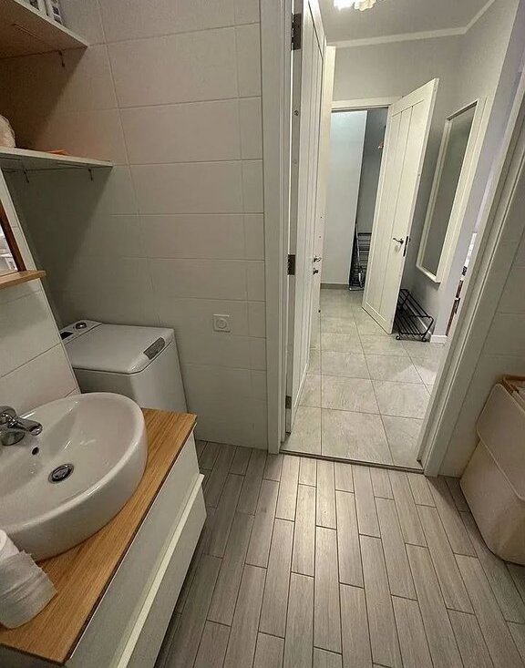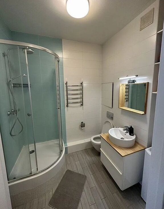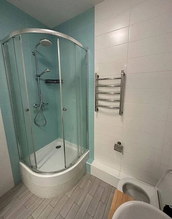 Просторная ванная с душевой кабиной. Стиральная машина.