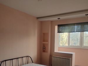 Изолированная спальня с двуспальной кроватью и ортопедическим матрасом, просторным шкафом-купе и полками.