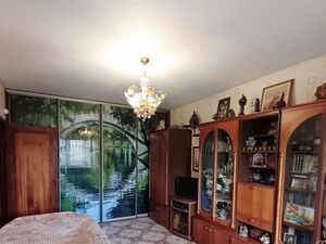 В квартире хороший ремонт. На кухне - большой кухонный гарнитур, вся посуда на 3 персоны, обеденный стол, 3-и табурета, электрическая плита с духовым шкафом, стиралка, холодильник - все немецкое. В комнате небольшой гардероб, двуспальный диван - IKEA.