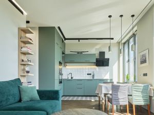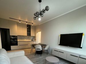 Жилая площадь 55.4 кв. м, кухня 19.3 кв. м, комнаты изолированные. Квартира меблированная, есть бытовая техника: стиральная машина, холодильник, телевизор, встроенная техника, есть интернет и домашний телефон. Раздельных санузлов 1, есть ванна, душевая кабина.
