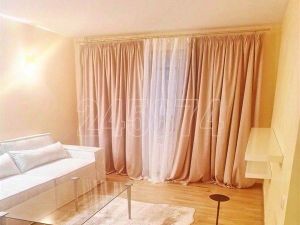 Квартира 127: Предлагается в аренду от 11 месяцев компактная студия с кухней-гостиной и выходом на просторную лоджию. В квартире вся встроенная бытовая техника (холодильник, варочная панель, духовой шкаф, посудомоечная и стиральная машины), а также кухонный гарнитур с обеденным столом и стульями на две персоны. Квартира оборудована современной мебелью, выполнена в бежевой цветовой гамме. Во всех комнатах установлены кондиционеры. В гостиной расположен раскладной диван, установлен плазменный телевизор. В прихожей разместили шкаф с зеркалом внутри. В квартире один совмещенный санузел с душевой кабиной, стиральной машиной и раковиной с зеркальной подсветкой.