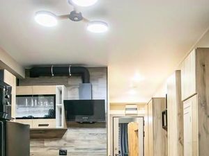В апартаментах сделан евроремонт, все продумано до мелочей. Комната с кухней обставлена необходимой мебелью, есть все для комфортного приготовления и проживания. Из техники в вашем распоряжении холодильник, варочная панель, стиральная машина и телевизор. Санузел совмещенный, оборудован современной душевой кабиной.