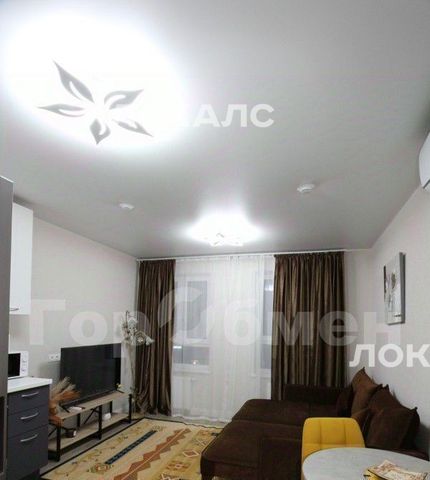 Установлена мебель (раскладной диван, шкаф купе, телевизор, микроволновая печь, стиральная машина, полотенцесушитель, зеркало, обеденная зона со столом и стульями).