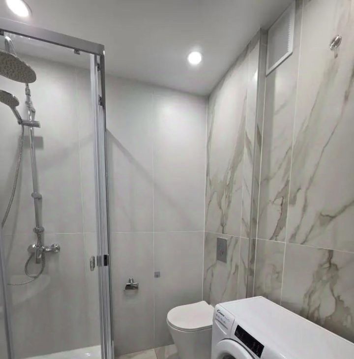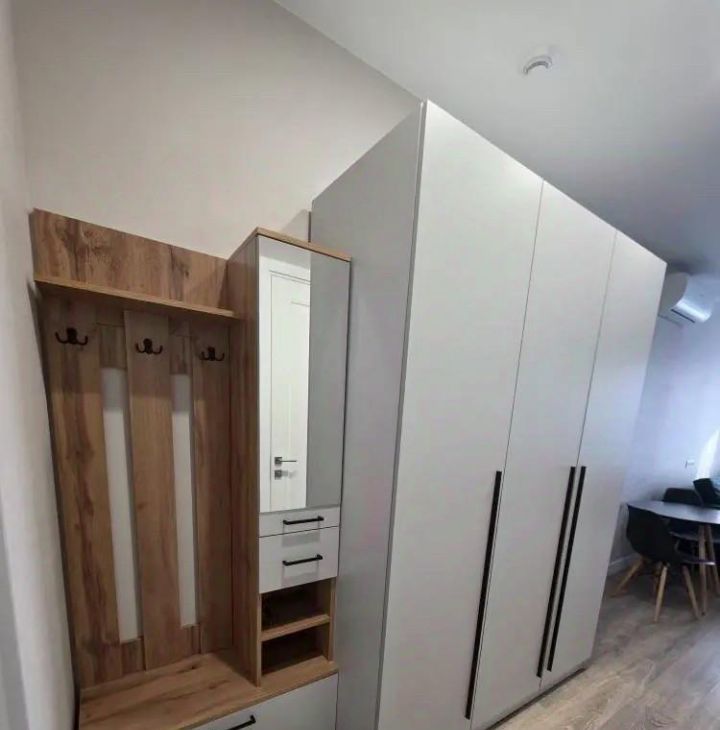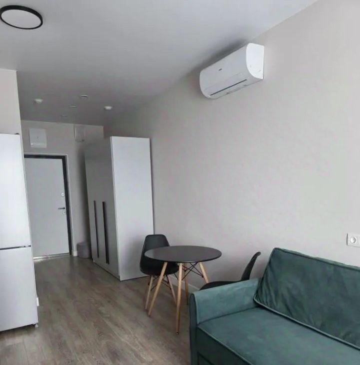 В студии есть вся необходимая мебель как на кухне, так и в комнате. Кухонная зона оборудована современной техникой: холодильник, посудомоечная машина и кондиционер. В комнате установлен телевизор, а также есть стиральная машина. Санузел совмещённый, с удобной ванной.