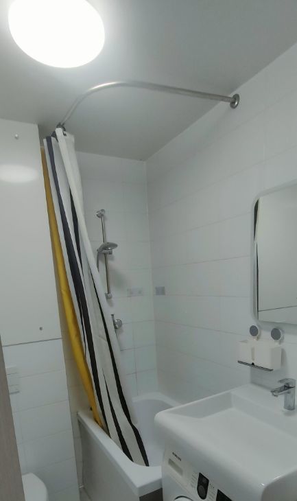 Ванная комната совмещена и оснащена стиральной машиной. Из мебели — вместительные шкафы и удобный диван. В квартире запрещено курение, проживание с детьми и животными также не допускается.
