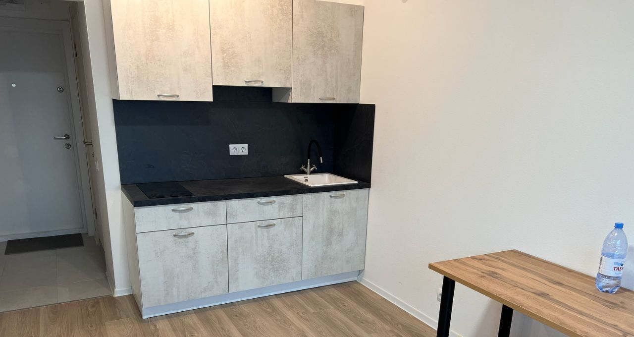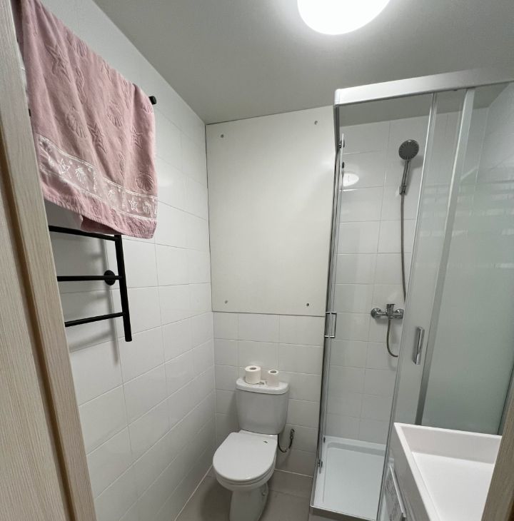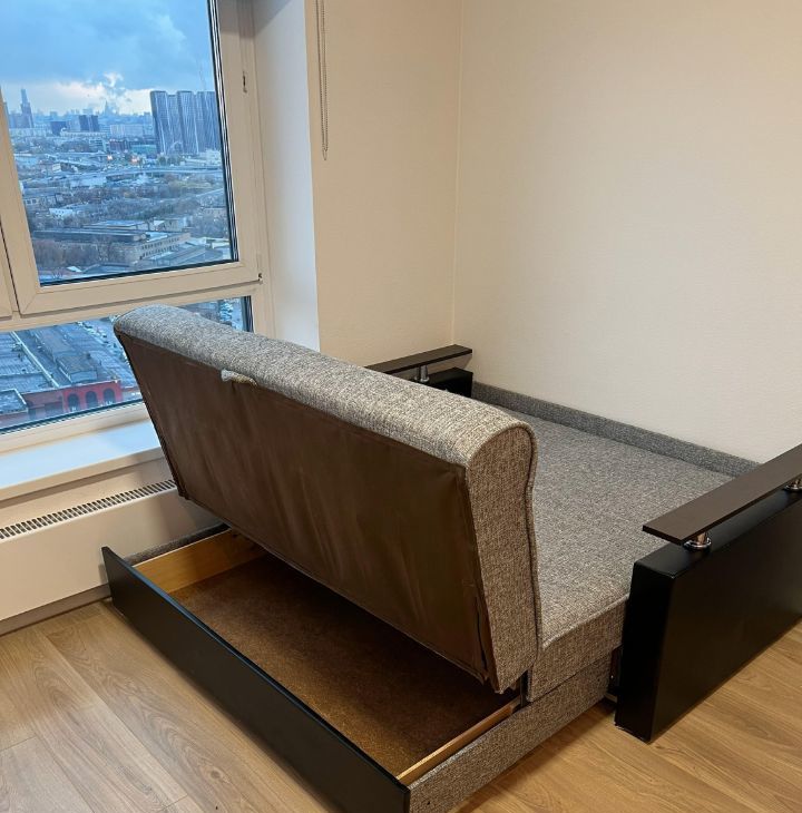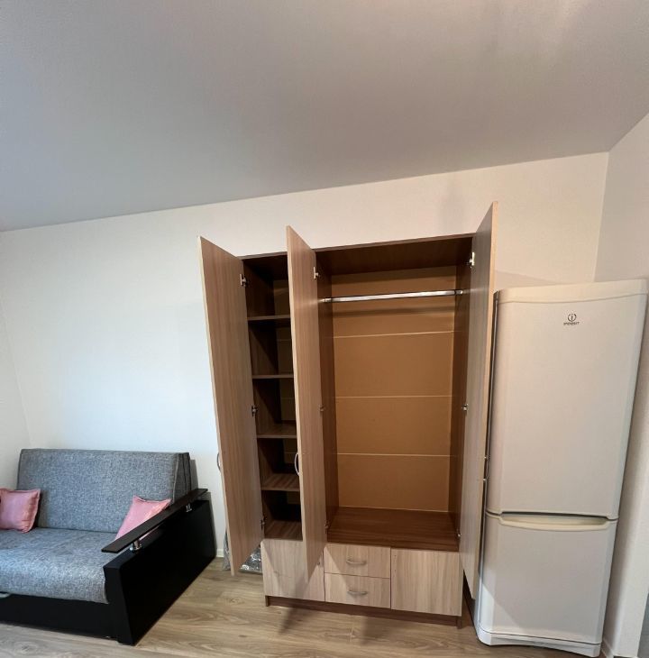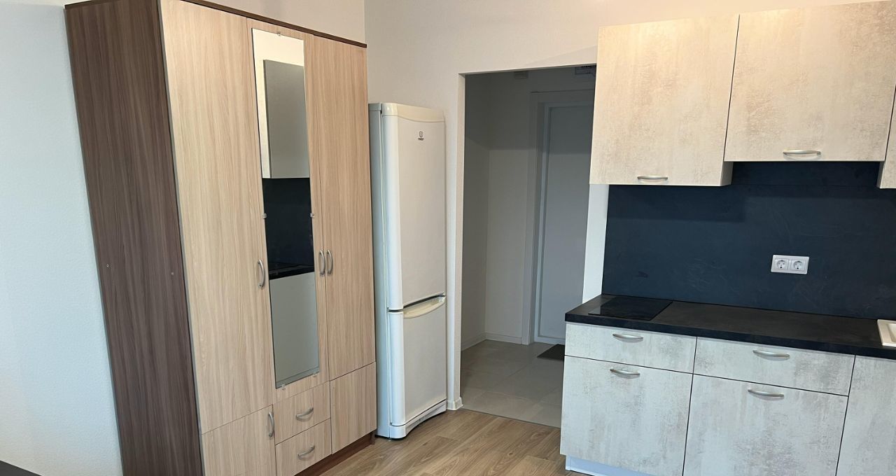 В квартире имеется раскладывающийся диван с ящиком для хранения белья, два шкафа для вещей, холодильник, новый качественный кухонный гарнитур с варочной панелью, новый стол и стулья, новая мебель в прихожей, новый и полностью укомплектованный санузел: раковина, стиральная машина, душевая кабина, шкафчик, батарея для полотенец.