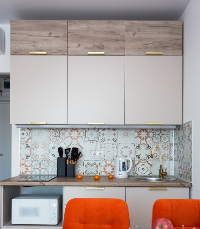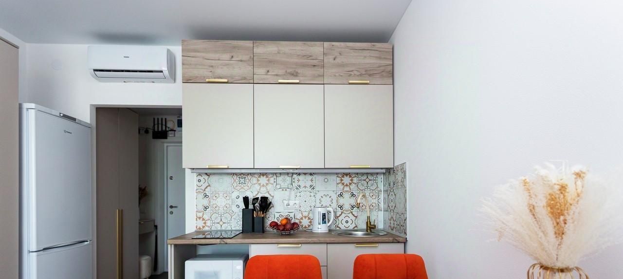 - Кухня: Большой холодильник, варочная панель, микроволновая печь, чайник. Есть обеденная зона со столом и мягкими стульями, вся необходимая посуда.