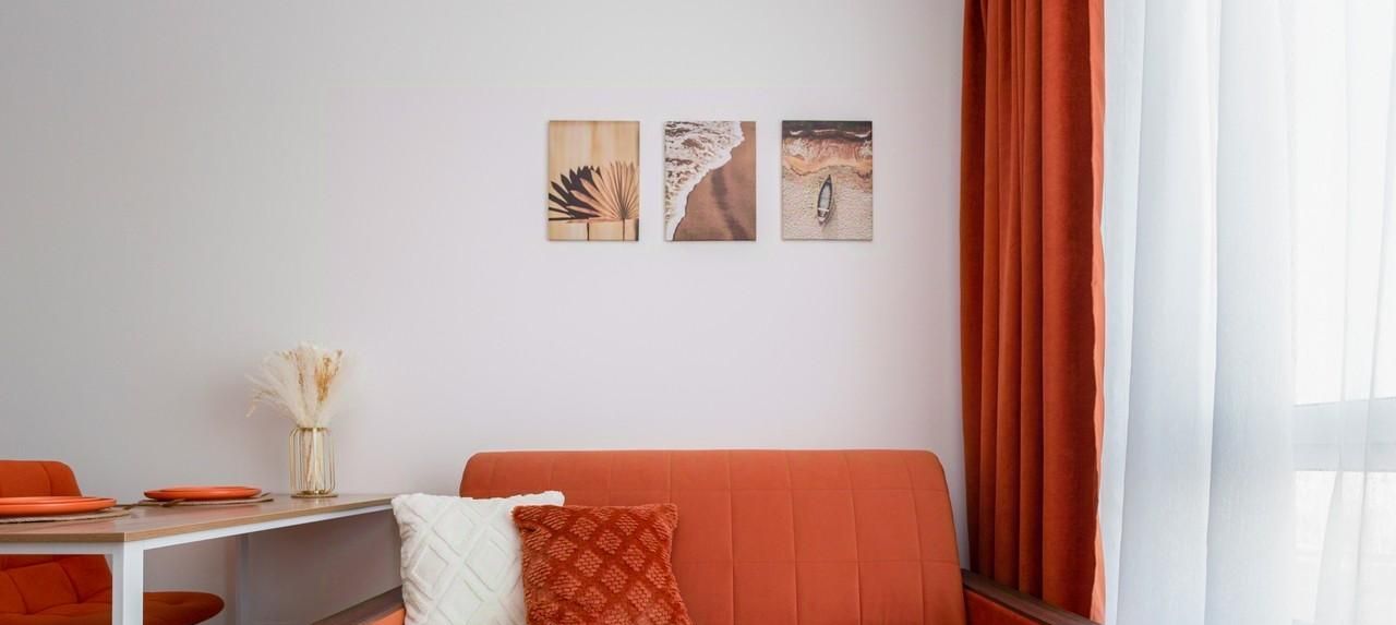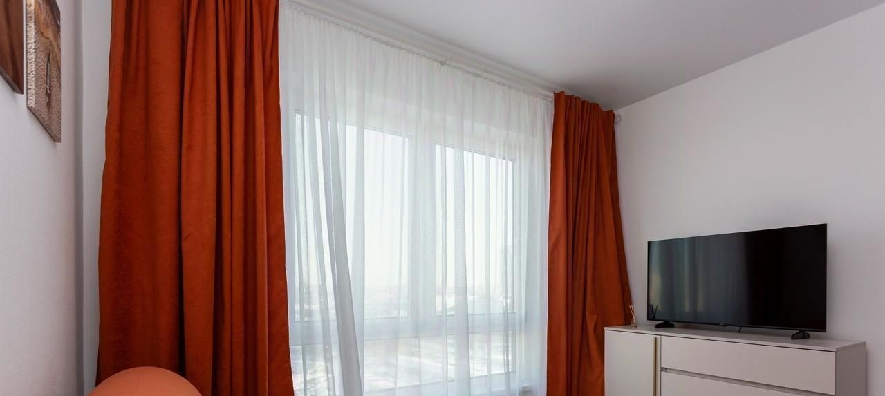 - Спальная/гостиная зона: Удобный раскладной диван, большой телевизор со Smart TV.