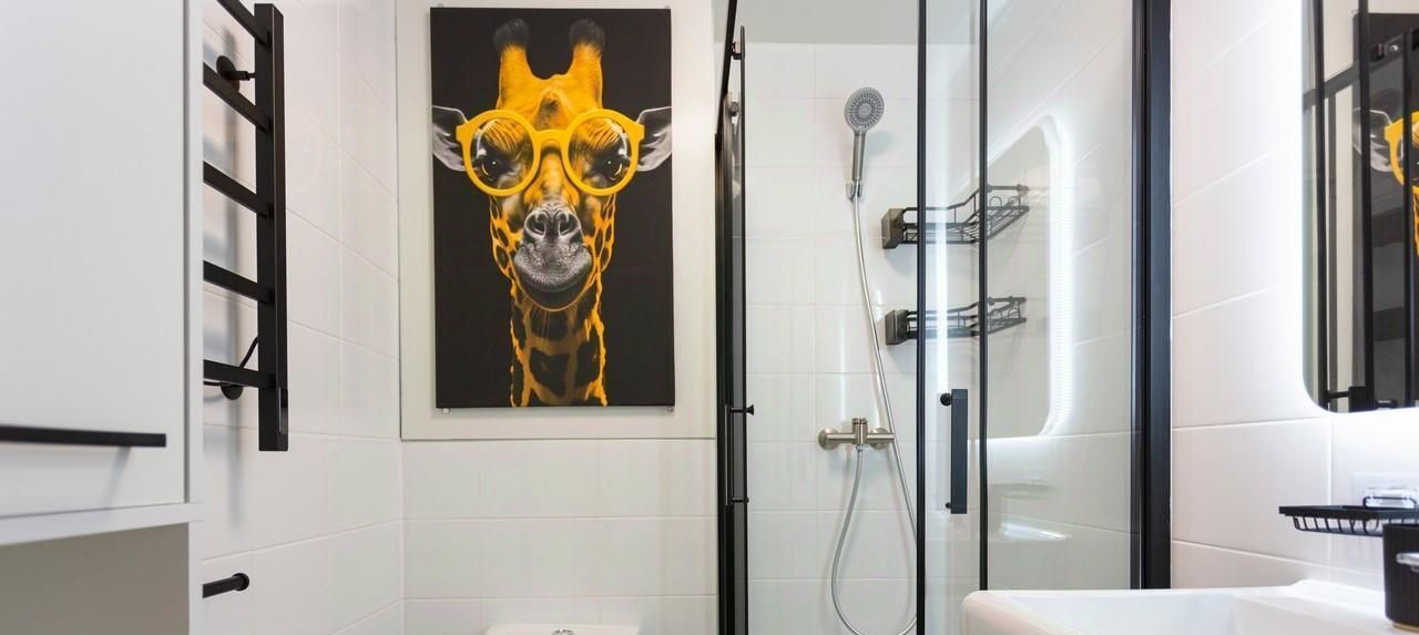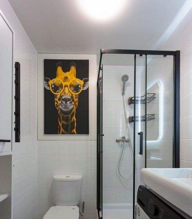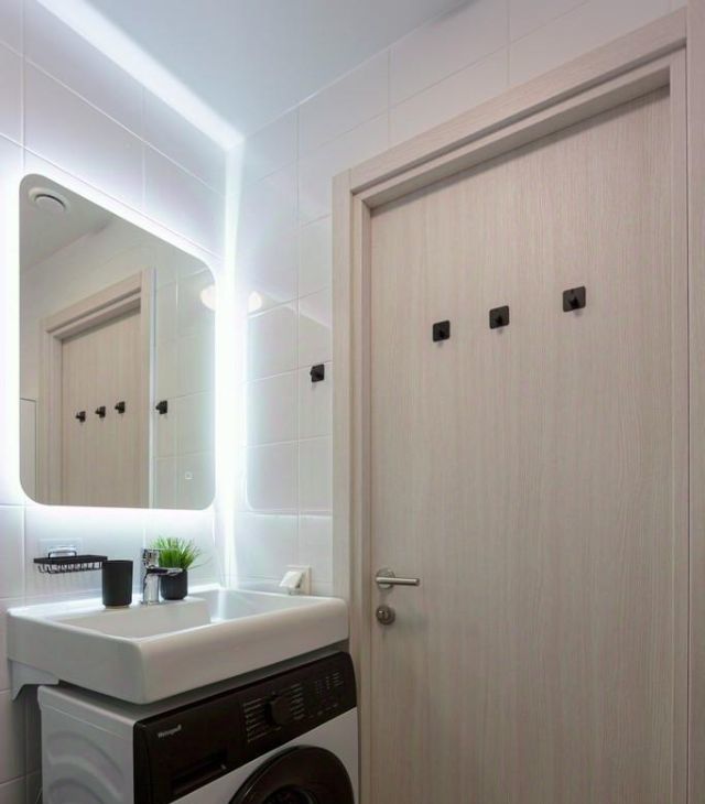 - Санузел: Душевая кабина, стиральная машина, зеркало с подсветкой. Есть шкафчик для хранения принадлежностей.