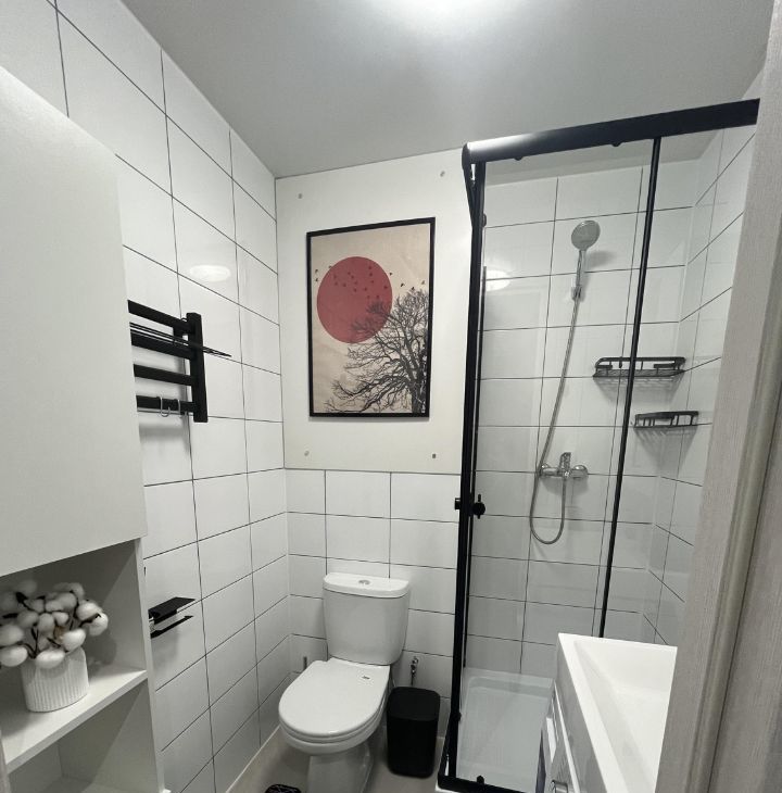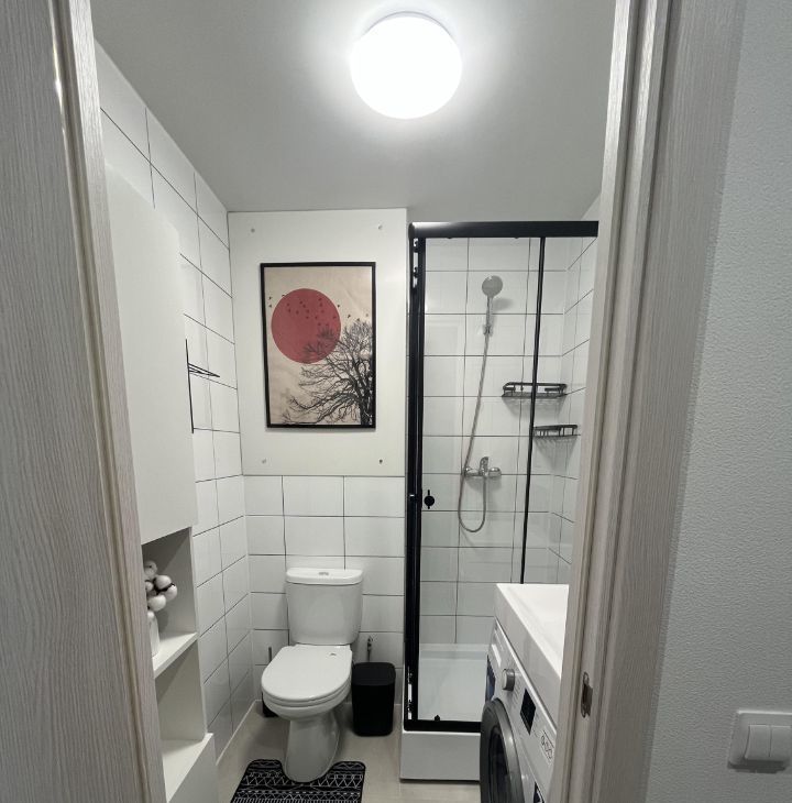 Зона для гигиены: душевая кабина, унитаз, раковина, шкаф пенал, навесной шкаф с зеркалом, стиральная машина. Все для вашей чистоты и красоты.