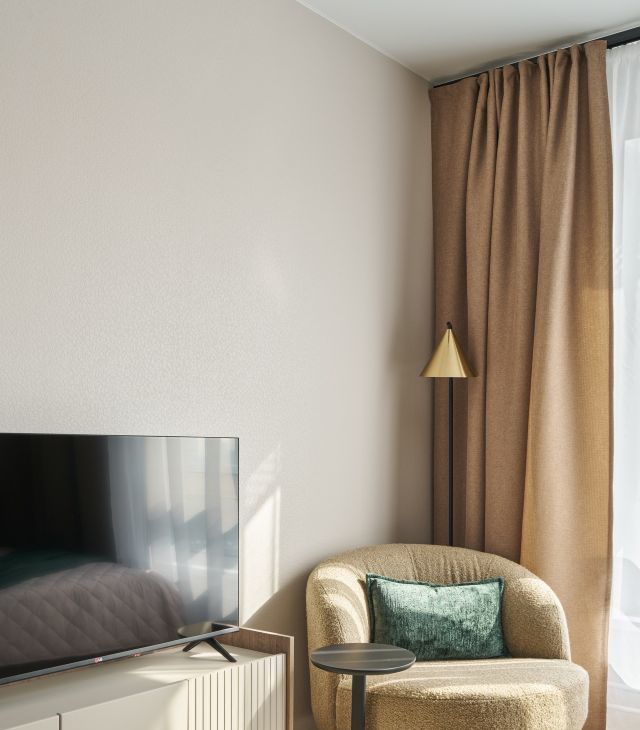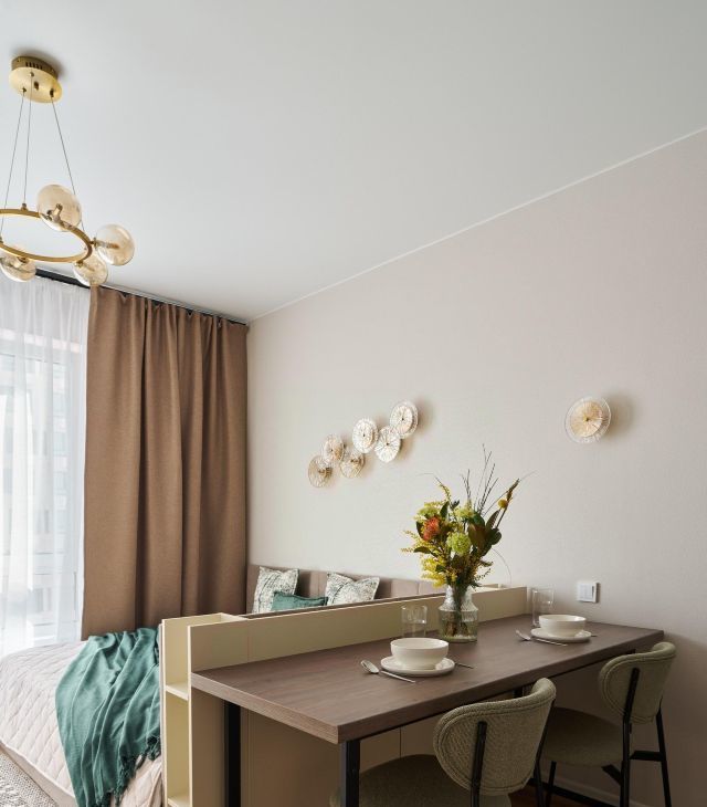 Студия укомплектована дизайнером (хоусмтейджером). В качестве стилистического решения выбрана нейтральная серо-бежевая база в