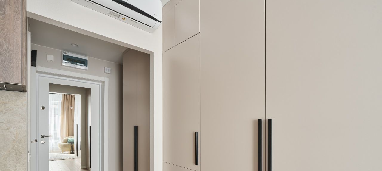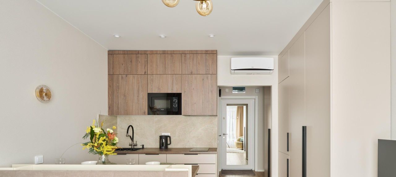 -на кухне установлена современная техника: кондиционер, холодильник, посудомоечная машина, свч, обеденная зона с 2-мя стульями, чайник;