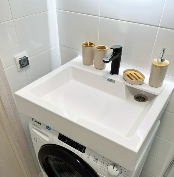 Бытовая техника: стиральная машина, холодильник, вытяжка, варочная панель, телевизор, электрический чайник, микроволновая печь.