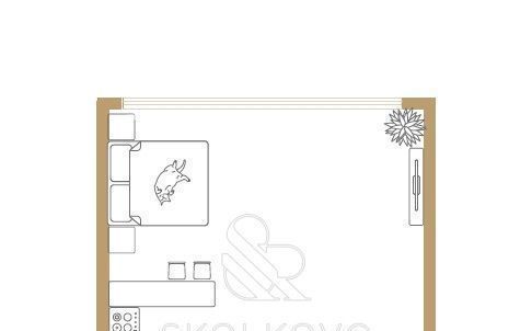 Удобная планировка: Пространство спальни, совмещенной с гостиной, эффективно организовано вдоль окна, позволяя наслаждаться максимальным количеством света и панорамным видом.