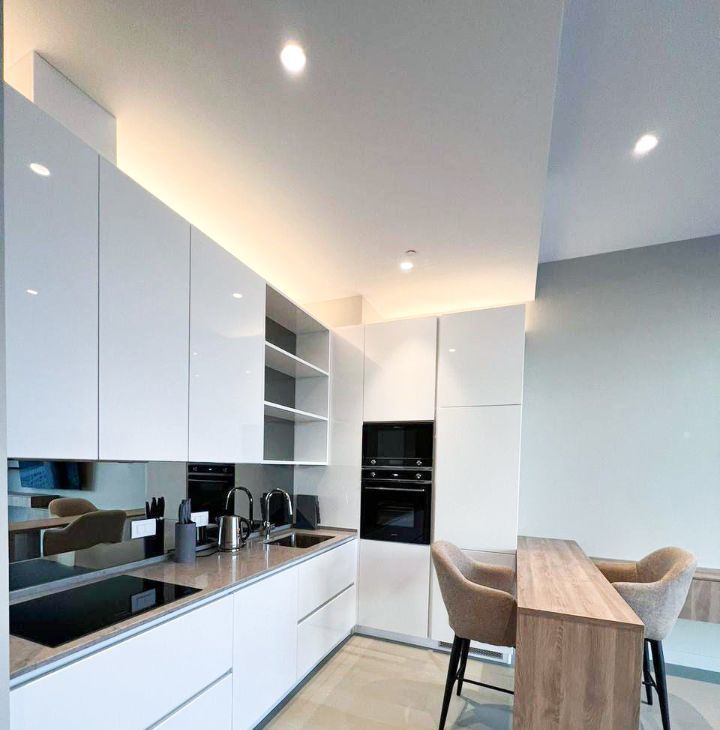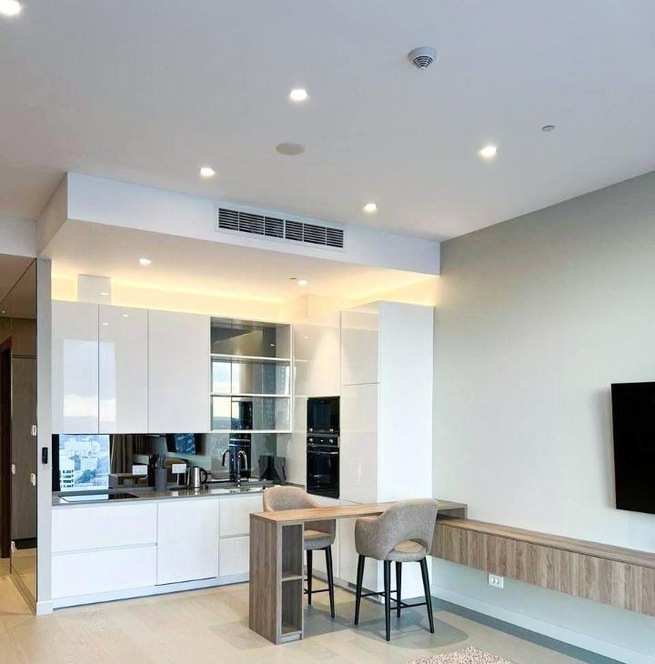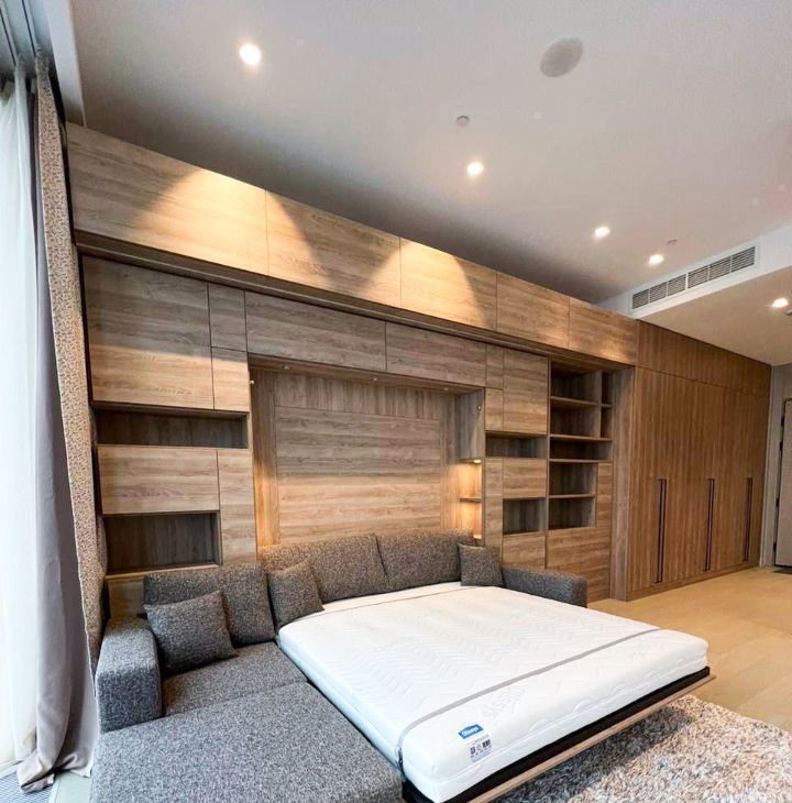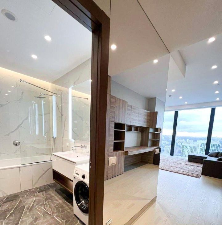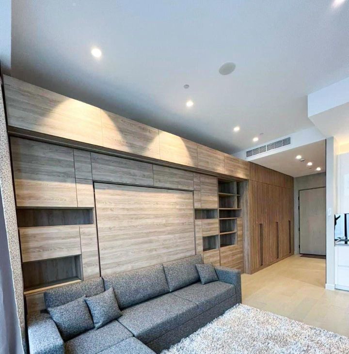 Предусмотрена максимально рациональная система хранения вещей. Диван и кровать-трансформер. Новый телевизор с диагональю 65". Новая кухня с встроенной техникой.