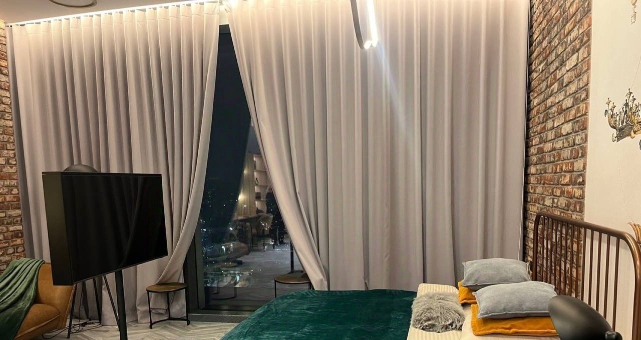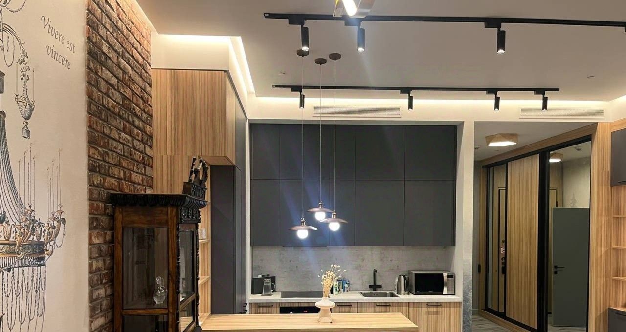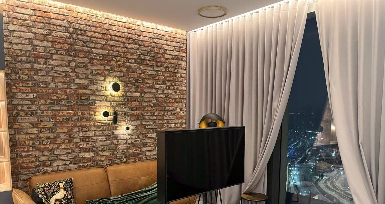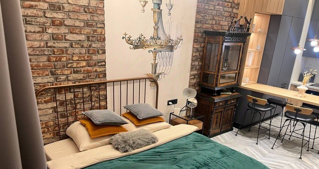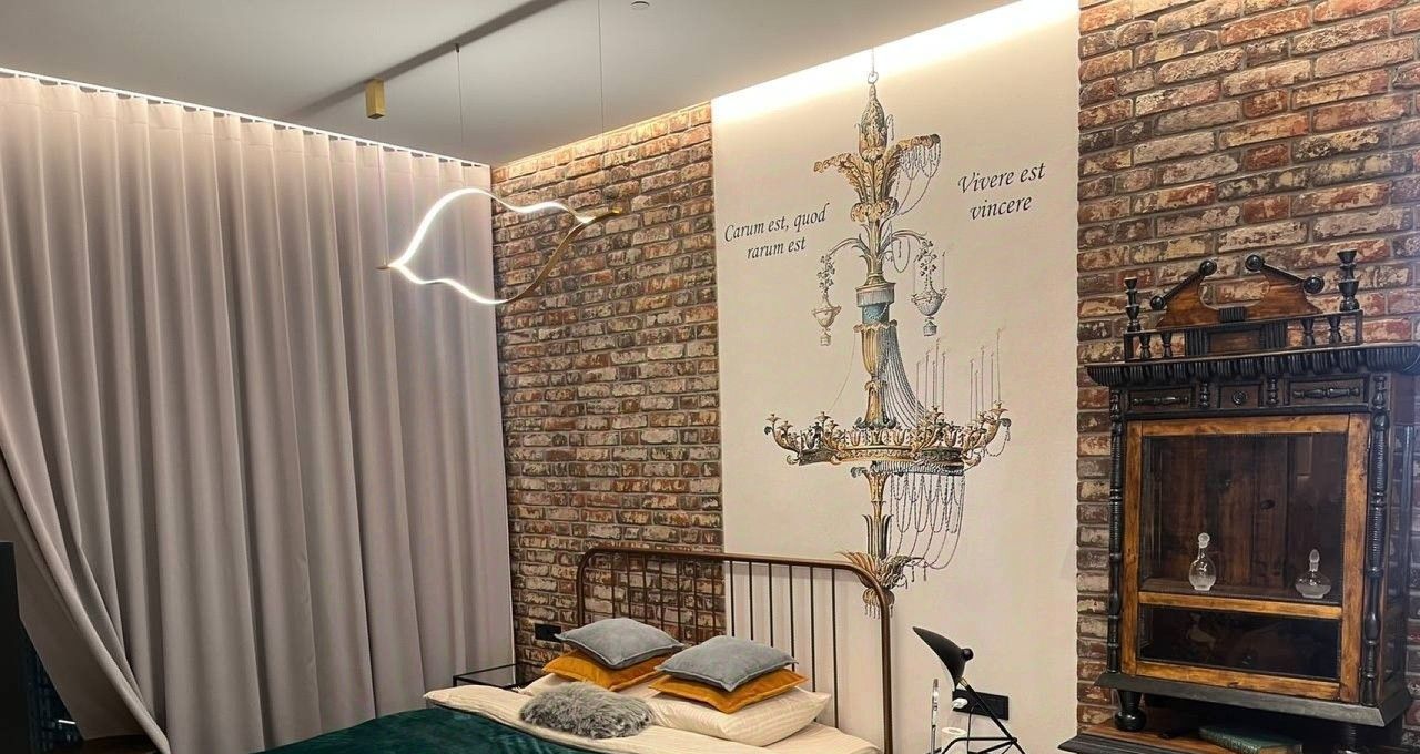 Студия с дизайнерским ремонтом в стиле мягкий лофт.
